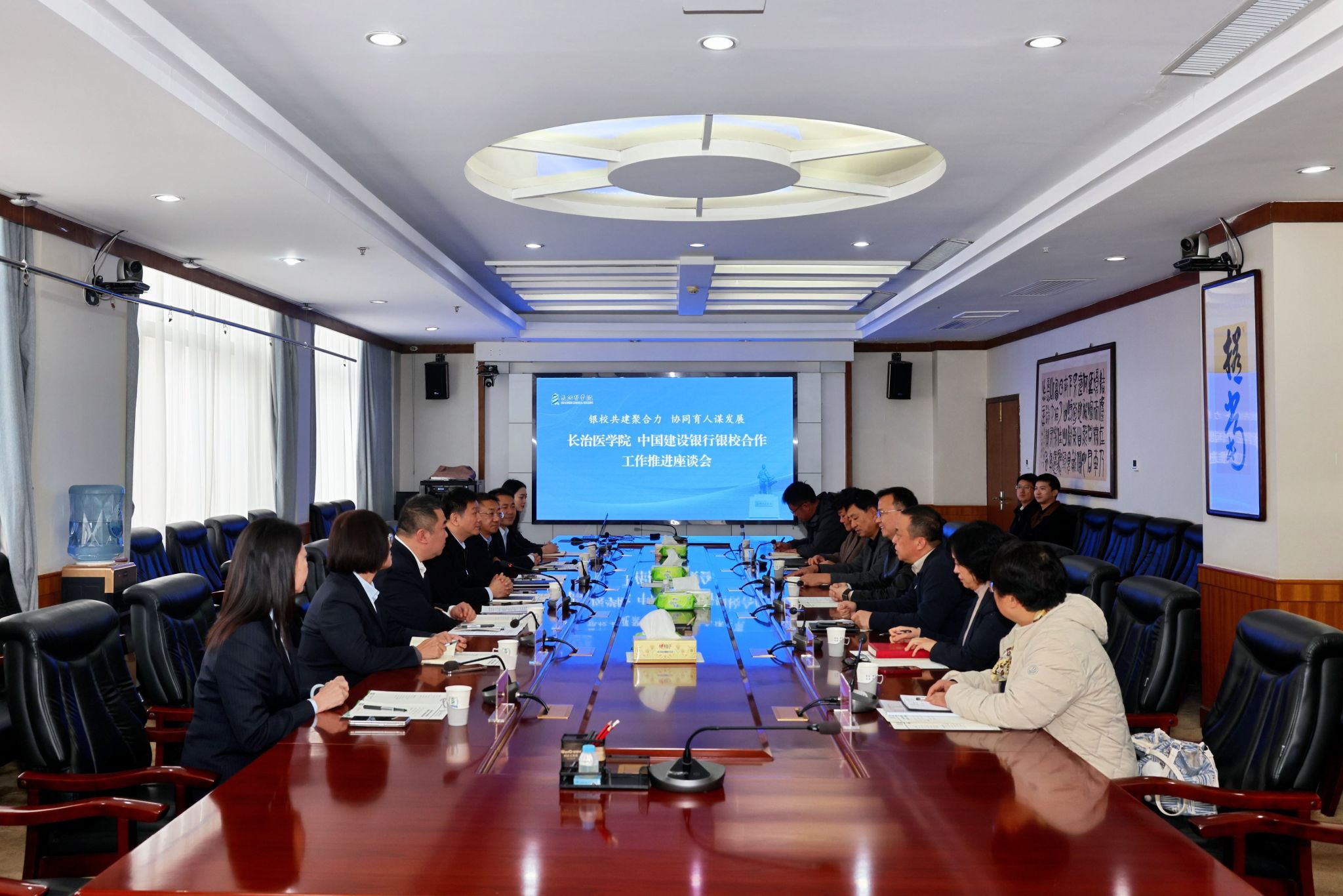 银校共建聚合力,协同育人谋发展。10月23日,我校与中国建设银行举行银校合作工作推进座谈会。中国建设银行山西省分行党委书记、行长肖倬一行七人专程来校调研座谈。我校党委书记王金胜,党委副书记、校长王旭,副校长李长江,党委常委、副校长来丽娜出席会议。计划财务部、资产管理部、信息网络中心等相关部门负责人参加会议。会议由王旭主持。会上,王旭代表学校对肖倬一行的到来表示热烈欢迎,对中国建设银行为学校建设、发展提供的支持表示感谢。...