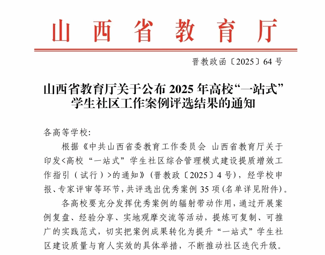 近日,山西省教育厅印发《关于公布2025年高校“一站式”学生社区工作案例评选结果的通知》(晋教政函〔2025〕64号),经学校申报、专家评审等程序,共评选出优秀案例35项。我校报送的《“三维驱动”打造“一站式”学生社区育人新范式》案例成功入选,展现了学校在学生社区建设与育人模式创新方面的积极探索与显著成效。此次入选省级优秀案例,是对我校“一站式”学生社区建设工作的充分肯定。学校将持续深化“三全育人”改革,推动学生社区迭代升级,...