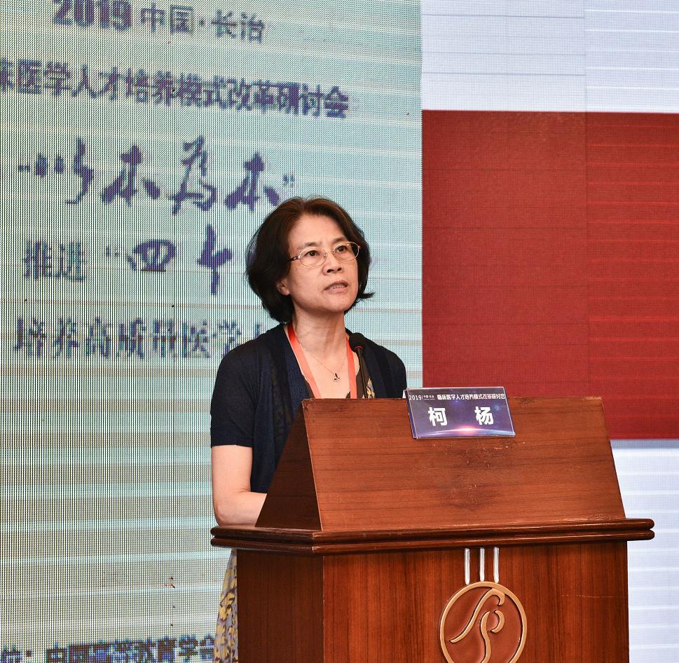 柯杨在开幕式上致辞,代表中国高等教育医学专业委员会对本次研讨会的召开表示热烈的祝贺,向长期以来关心、支持、帮助学会工作的各位专家、学者、医学教育同道表达了衷心的感谢。她强调了医学教育教学改革的重要性,号召大家立足民生健康,把握教育规律,促进医学教育发展。