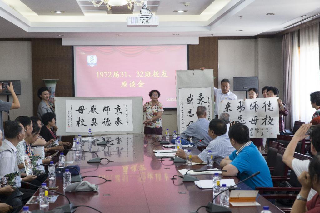 参加座谈会的每个校友轮流作了自我介绍,向老师们汇报了自己的近况并对老师、学校的培育之恩表示了诚挚的谢意。校友们向母校捐赠了3幅写有“秉承师德、感恩母校”的字画和纪念品,胡春香代表学校接受了捐赠。