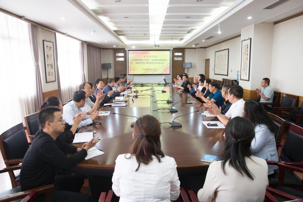 二级院系开展师生座谈会。教师节期间,各二级院系开展了各种形式的师生座谈交流会。通过座谈,教师们进一步体会到了教师职业的神圣与光荣、新时代教师职业的崇高与荣耀,激发了爱岗敬业的工作热情;学生们表达了对老师的爱戴与感恩,表示将更加热爱老师、尊敬老师,坚定为社会主义医学事业献身的信心和决心。