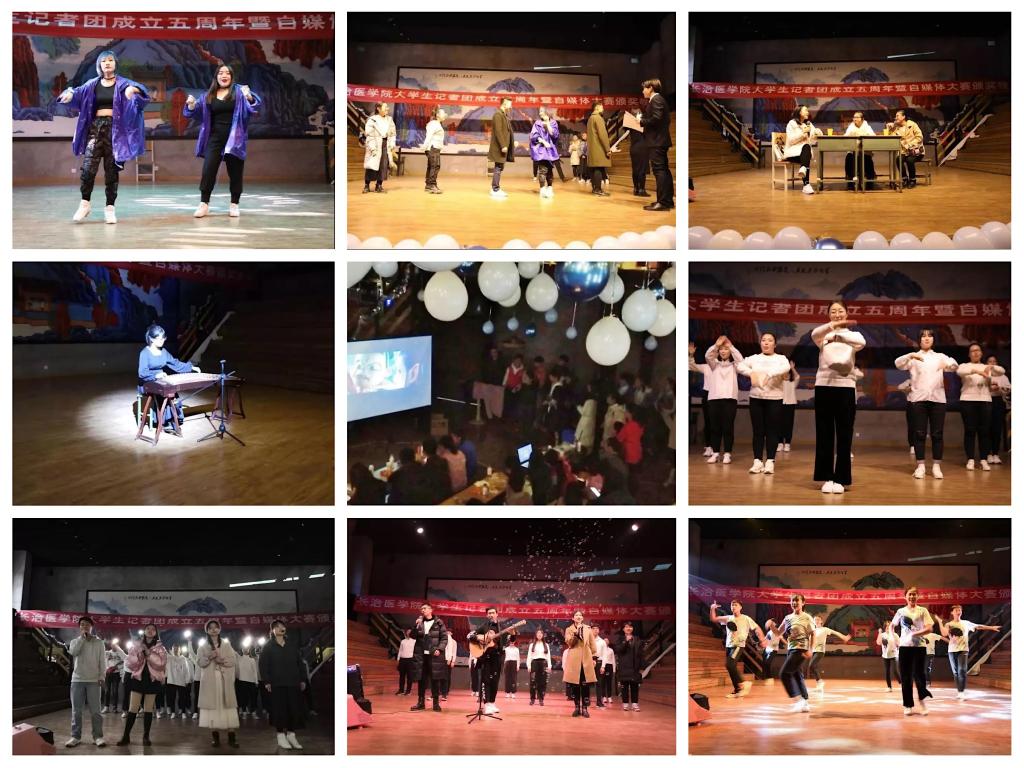 接下来精彩的节目让观众目不暇接。视觉部和策划部的歌舞串烧《恋爱循环》《带你去旅行》让我们感受到记者团成员对美好生活的深切向往;杯子合舞让我们看到当年的初心,那梦开始的地方是碰撞的记忆缝隙;群口相声《采访》诉说了记者的成长经历,因热爱所以追寻;五龙校区广播站的《青春disco》描绘着每一个同学的大学青春,有着对未来的渴望和追求理想的真心;吉他弹唱《让世界美好与你环环相扣》用音符讲出经历过的甘甜酸涩;舞蹈《trouble maker》以炫动律韵激昂这最好的时节,点亮这些年深厚的工作情谊。之后紧张激烈的游戏环节更开启了呐喊的氛围,手势猜词是个人的能力展示,也考验着团队的集体协作。记者团各中心和广播站带来的小品表演《同学聚会》、古筝曲演《青花瓷》、配音《声临其境》、手语舞《仰望星空》、歌曲《小幸运》、朗诵《四季之约》将学生记者的风采尽情展现,赢得阵阵掌声、喝彩不断。交谊舞协会友情表演的《katchi》,一颦一蹙、一张一合都是关于梦的故事,让现场观众领略了不一样的社团才艺。