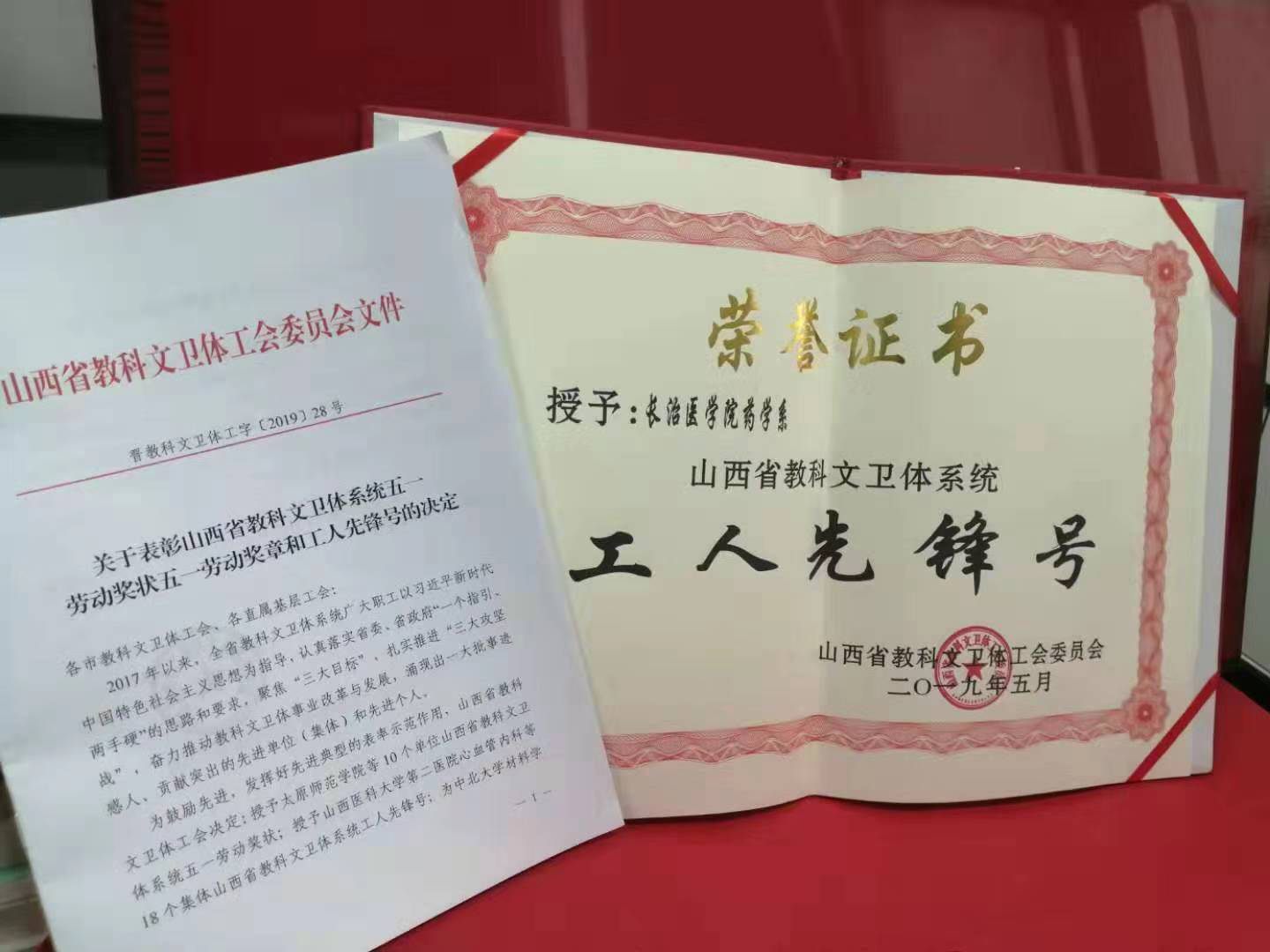 在中华人民共和国成立70周年之际,山西省教科文卫体工会于今年五一劳动节前夕组织了先进集体和先进个人评选活动,近期活动结果揭晓,我校药学系荣获山西省教科文卫体系统 “工人先锋号”称号,这是继2018年荣获“山西省三八红旗集体奖”以来的又一殊荣。
