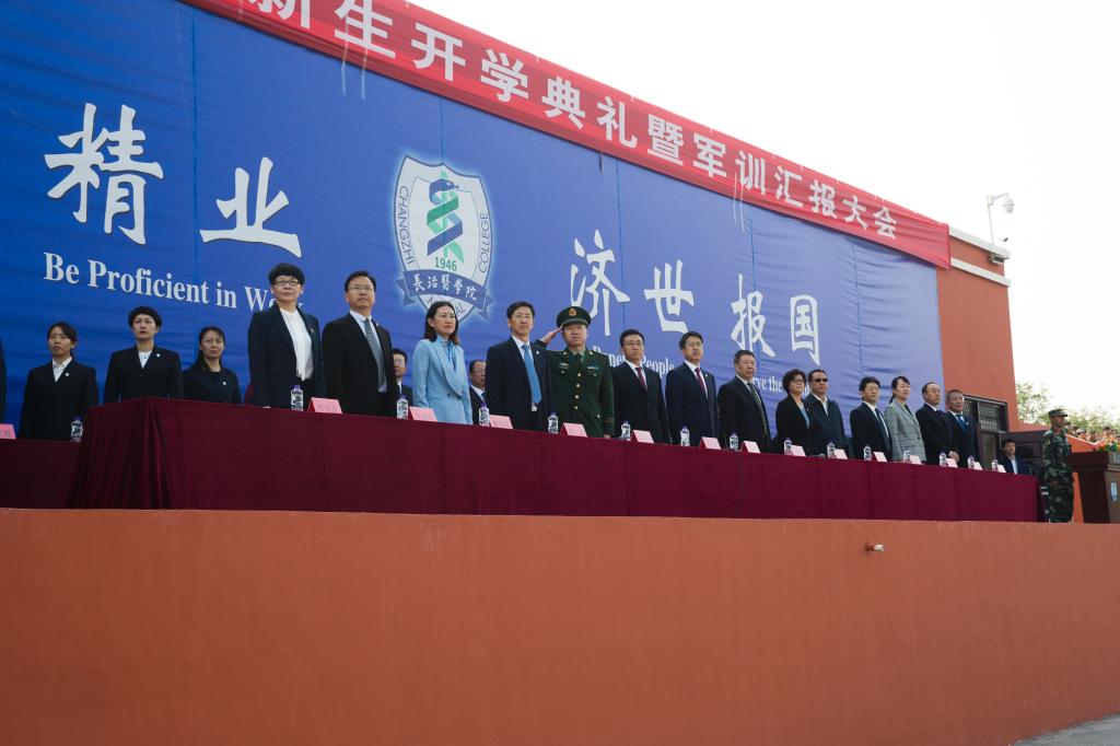 9月22日上午,我校在五龙校区体育场举行2019级新生开学典礼暨军训汇报大会。长治市上党区区委副书记、区长段尧刚,区人大常委会主任张向东,区政协主席魏俊英,副区长石玉;武警山西总队长治支队副参谋长杜刚;我校党委书记李华荣,校长郑建中,党委副书记张芳萍,纪委书记杨波,副校长宋晓亮、王金胜及各二级院系部的党政领导出席大会。李华荣主持开学典礼,宋晓亮主持军训汇报。