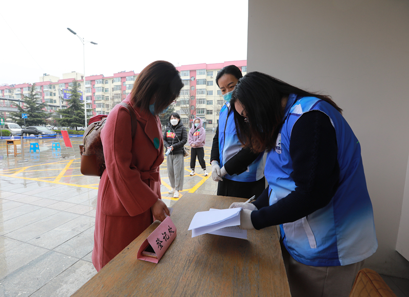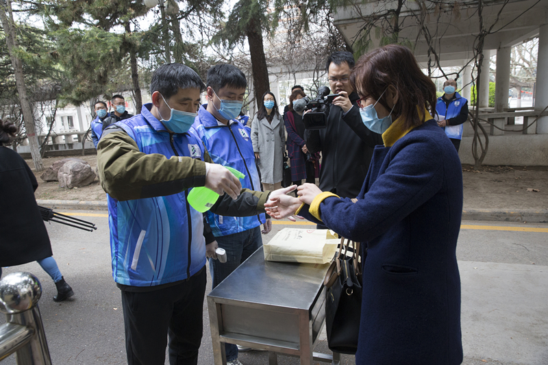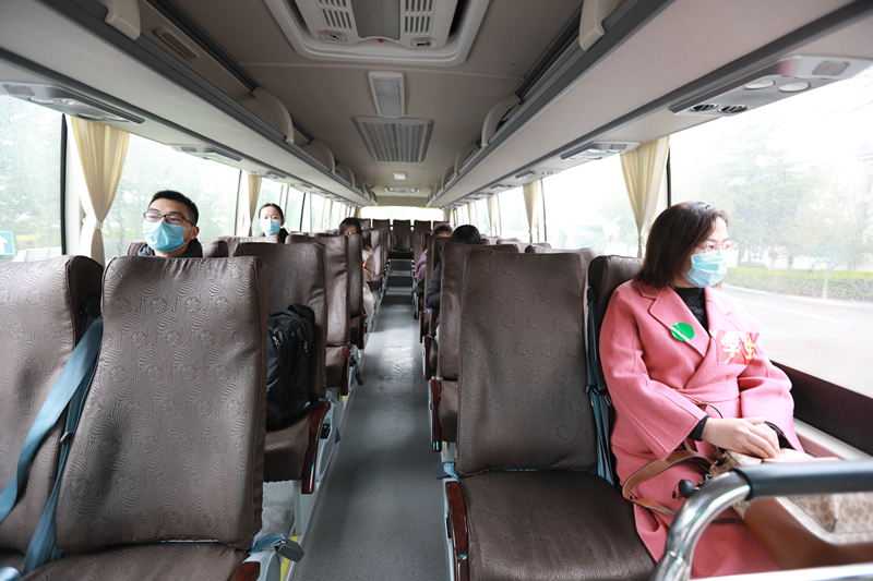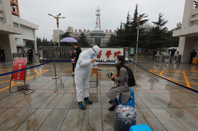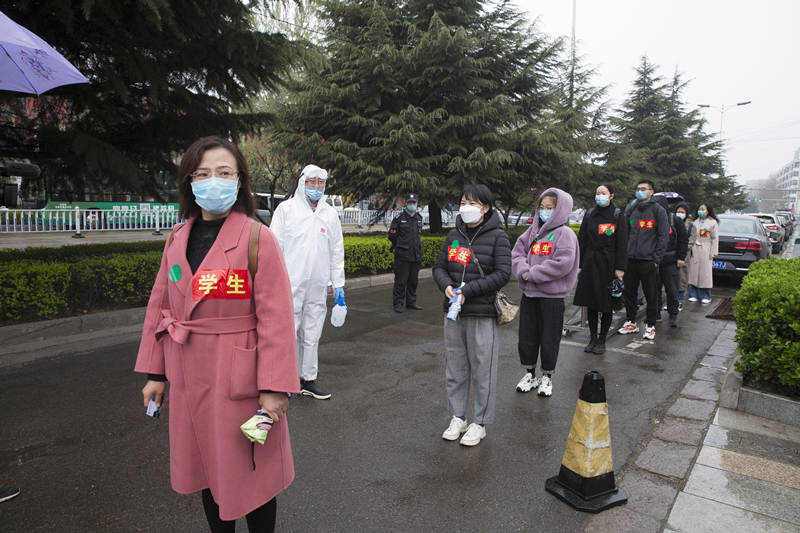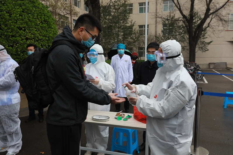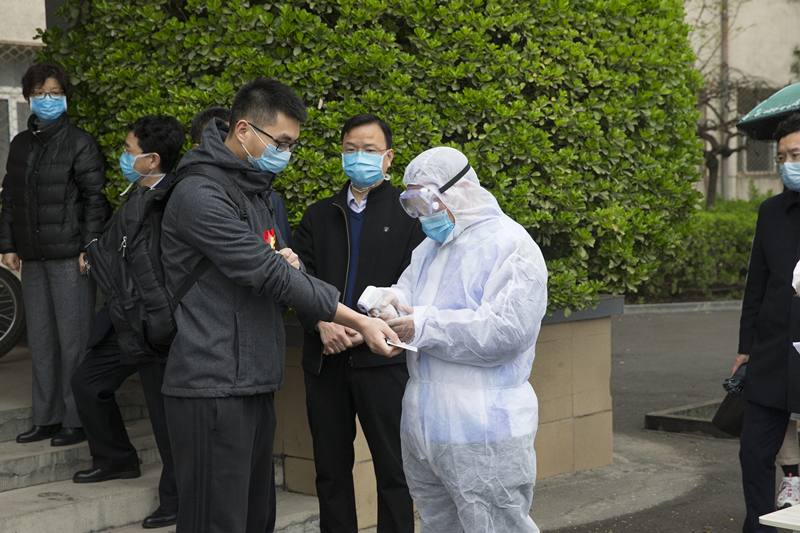 学校成立接站工作组,在火车站安排了学生报到测温区、消毒区、隔离区和等候的运输车辆。到站的同学由学校引导人员按1米间距排队,有序进行体温检测、人员行李消毒、学生信息登记,核实身份后体温正常者按引导搭乘校车返校。