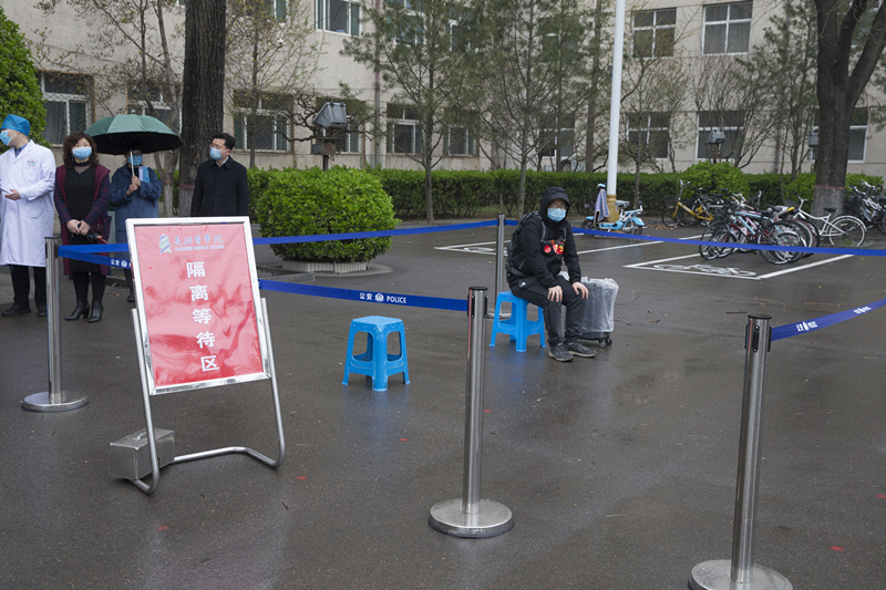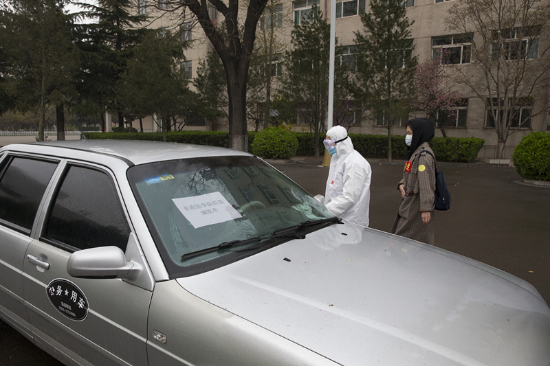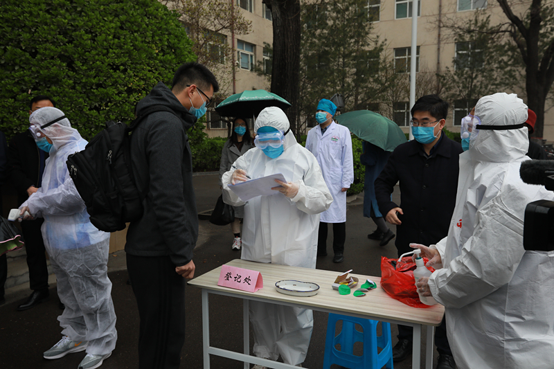 其中,有一名同学乘坐私家车返校,工作人员首先对该同学家长进行劝返;随后引导该同学测量体温时,发现该生体温异常,负责报到的工作人员将其带隔离区等待二次测温。二次测温仍显示体温偏高,工作人员拨打和平医院急救电话,报告学生发热情况,请求支援。同时,向学校疫情防控领导小组报告发热同学情况。5分钟后急救车赶到,医护人员将发热学生送往和平医院发热门诊做进一步排查。