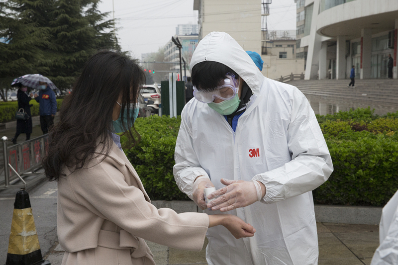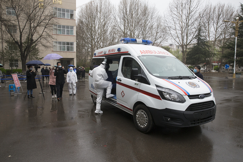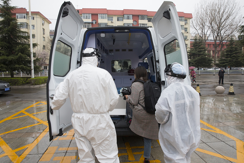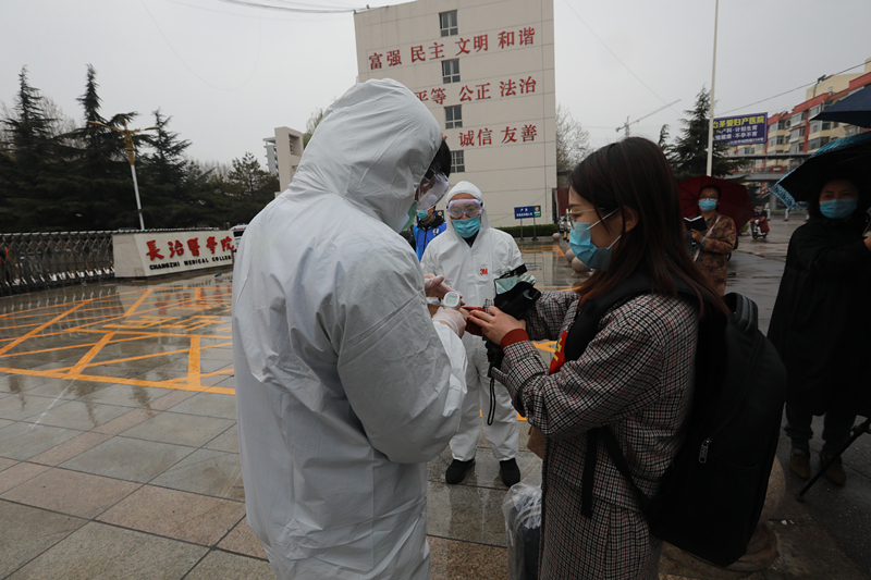 其中一名同学体温异常,工作人员引导其在隔离区等待并二次测温,二次测温显示体温依旧偏高,工作人员拨打附属和平医院急救电话,报告学生发热情况,请求支援。同时,向学校疫情防控领导小组报告发热同学情况。5分钟后急救车赶到,医护人员将发热学生送往附属和平医院发热门诊做进一步排查。
