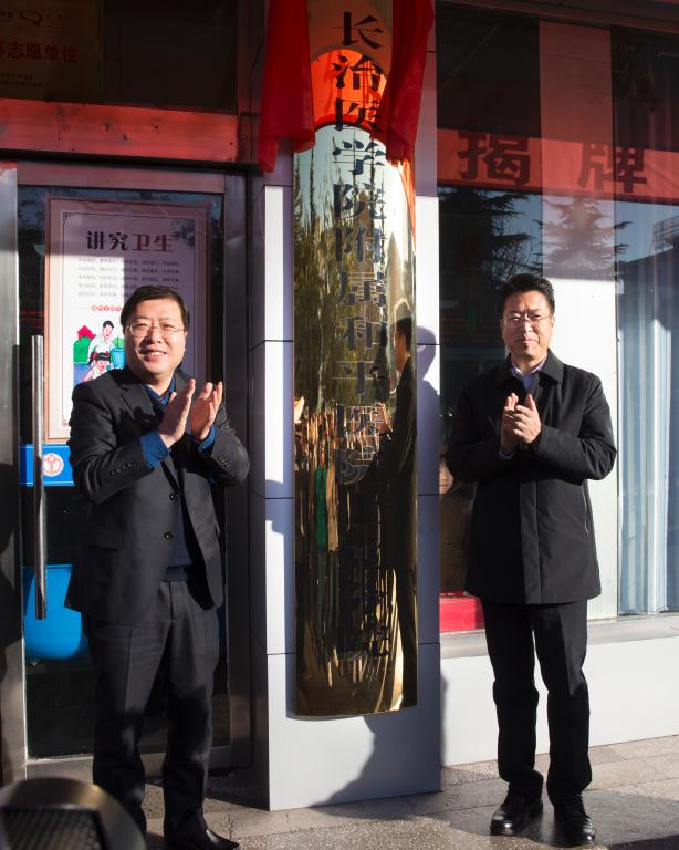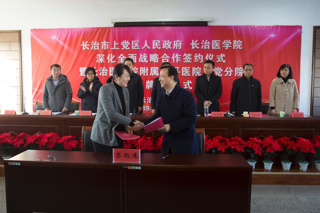 我校党委书记李华荣、上党区委书记张驰共同为附属和平医院上党分院揭牌,校党委副书记张芳萍、上党区区长段尧刚共同为和平医疗集团上党医院揭牌,校党委常委、副校长王金胜和上党区副区长石玉分别代表双方签署战略合作协议。