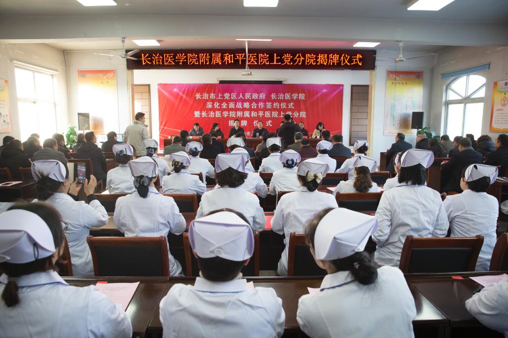 “和平医疗集团总院”揭牌仪式后,与会领导赴上党区医院,参加了长治市上党区人民政府、长治医学院深化全面战略合作签约仪式暨长治医学院附属和平医院上党分院揭牌仪式。