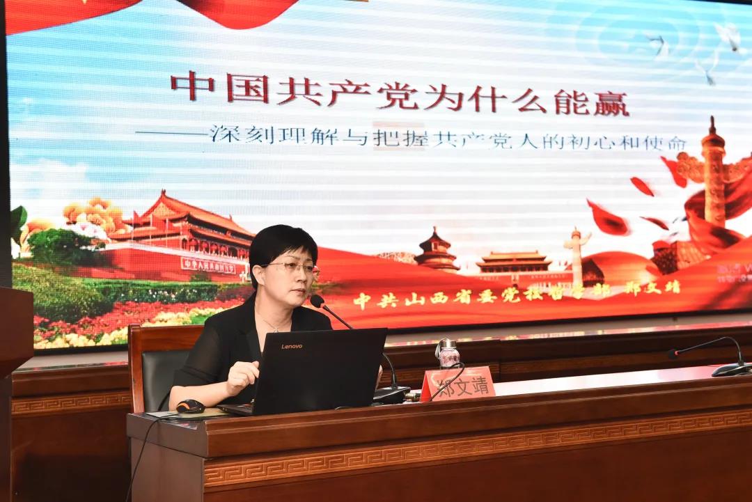 郑文靖教授以《中国共产党为什么能赢——深刻理解与把握共产党人的初心和使命》为题,回望分析了晚清政府、北洋政府、国民党政府的失败历史,对比之下引出了中国共产党能赢的原因,深入浅出地将中国共产党比作“有志青年、担当青年、奋进青年”,通过一系列史实讲述了历史怎样将重担压在了中国共产党的肩头,中国共产党又怎样抓住了这一历史机会。