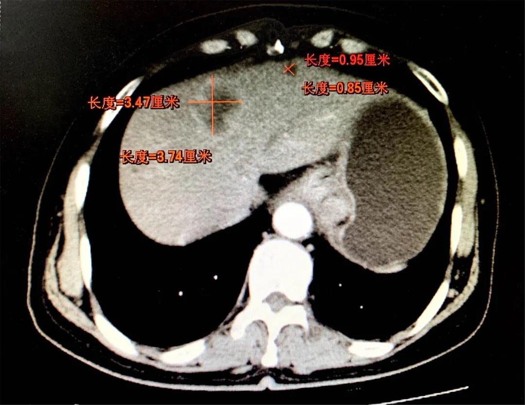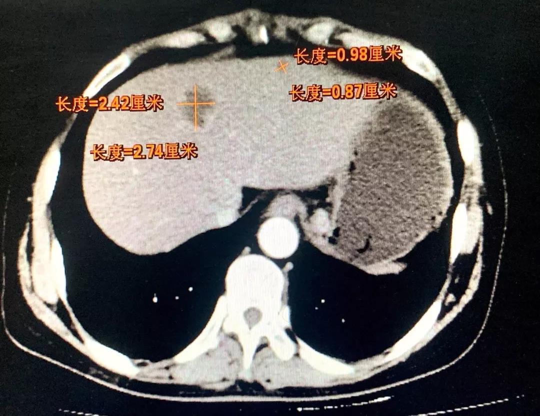 8月前患者就诊于晋城市某医院行胃镜示:胃癌,病理示:腺癌。进一步行腹部增强CT示:贲门胃底小弯侧占位,周围见肿大淋巴结;肝内低密度肿块影,考虑转移。遂就诊于和济医院,入院诊断为:“1.胃癌肝转移(cT4N2M1) 2.肝脏多发囊肿3.原发性高血压(2级,低危组)4.卵巢囊肿切除术后”。经医院消化病中心MDT讨论,并与患者及家属充分沟通后,决定先为其行转化治疗(方案:DOS)。转化治疗2个周期后患者症状明显好转,体重增加约10kg。肿瘤原发病灶较前缩小、肝脏转移灶较前缩小。继续行转化治疗(方案:DOS)3个周期后,患者肿瘤原发病灶较前增大、肝脏转移灶较前继续缩小。经和济医院消化病中心再次MDT讨论并与患者及家属充分沟通后,决定手术治疗。术中胃肠外科张晋杰医师、张康康医师先行腹腔镜辅助根治性全胃切除术+D2淋巴结清扫+Roux-en-Y吻合术,术中邀请肝胆外科主任程丹桂主任医师、刘军廷副主任医师以及超声室武鹏副主任医师行彩超定位下左肝转移病灶射频消融术。术中射频消融在保证对左肝转移病灶精准处理的前提下,对肝脏以最小的创伤,起到最佳的治疗效果,整个手术创伤小,术后第3日开始进流食,5日行上消化道造影提示:未见吻合口瘘。目前患者已恢复正常进食,痊愈出院。