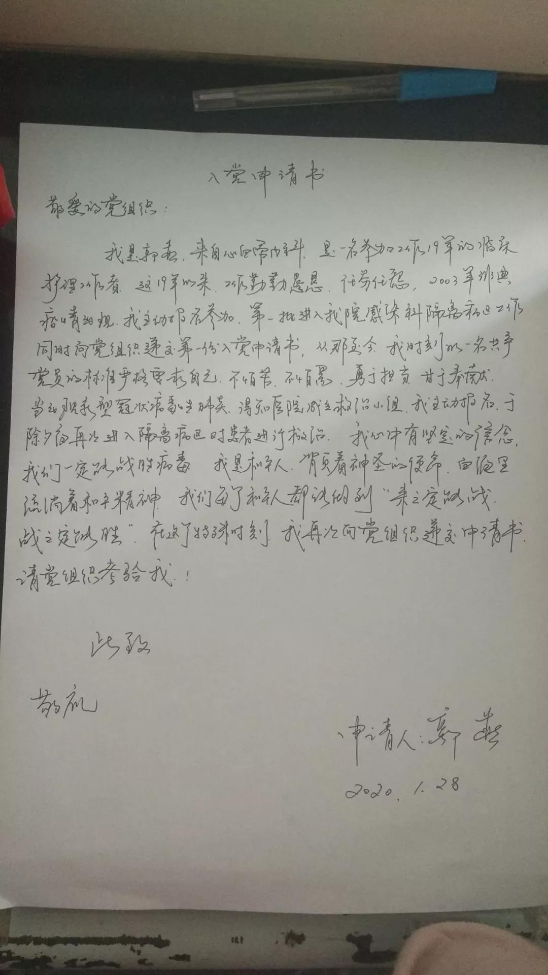“敬爱的党组织:只有经历过考验才懂得先锋模范的含义,我愿意在疫情一线锤炼意志,学习本领……我志愿加入中国共产党……随时准备为党和人民牺牲一切!永不叛党!请党组织监督我、考验我!”