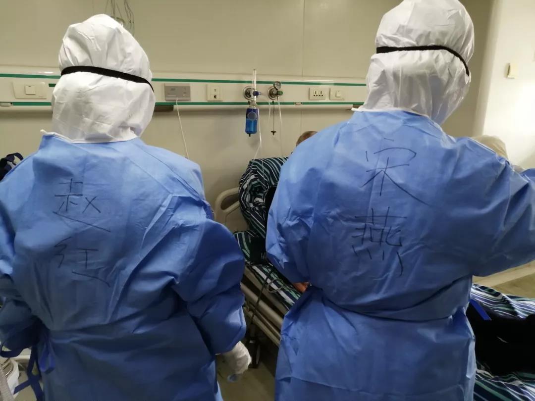 1月22日上午,冯旭娇穿着厚厚的防护服走出隔离病区,准备清洁好卫生后下班。同事闫跃武同样穿着厚厚的防护服走了过来,轻声问:“咋样?”
