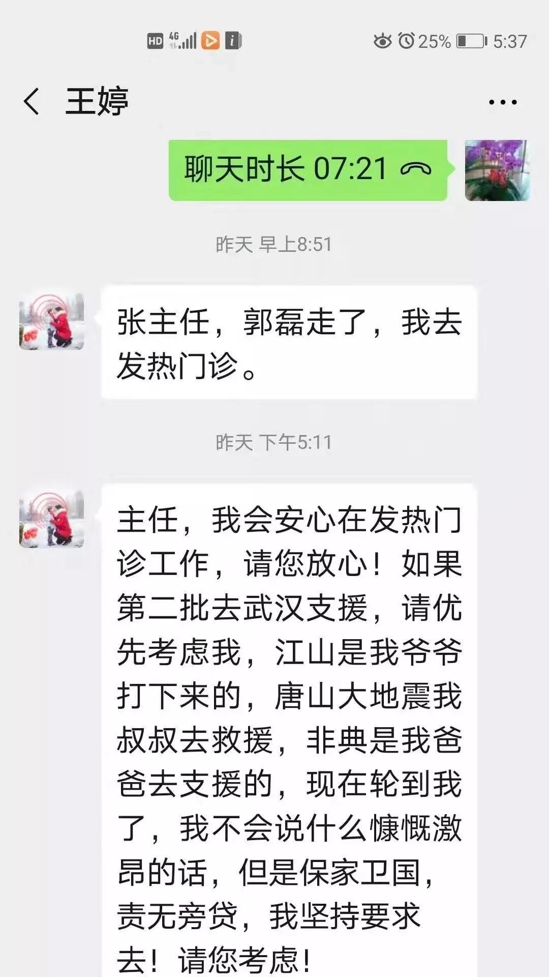 王婷,呼吸内科80后住院医师,政治素质高、业务能力强。她是拾金不昧暖人心的王婷医生、她是鲜血凝就医患情的王婷医生、她是精诚一片的王婷医生......她说她早就做好了抗击疫情的充分准备,呼吸内科医生都随时准备着,此次支援湖北的工作,身为医者、党员,这次是她人生中宝贵的历练,她一定圆满完成使命。在第一批驰援湖北人员走后,她主动向张冀军主任申请去发热门诊接替郭磊医生的工作,并直接提出如果需要第二批去武汉人员就优先考虑她。家庭的熏陶让她执意坚持要去:爷爷是军人,叔叔曾去救援唐山大地震,自己的父亲当年支援非典,现在她长大了,近日又学习了许多的防护知识,虽为女子,但是保卫国家,责无旁贷。她一再坚持要去。