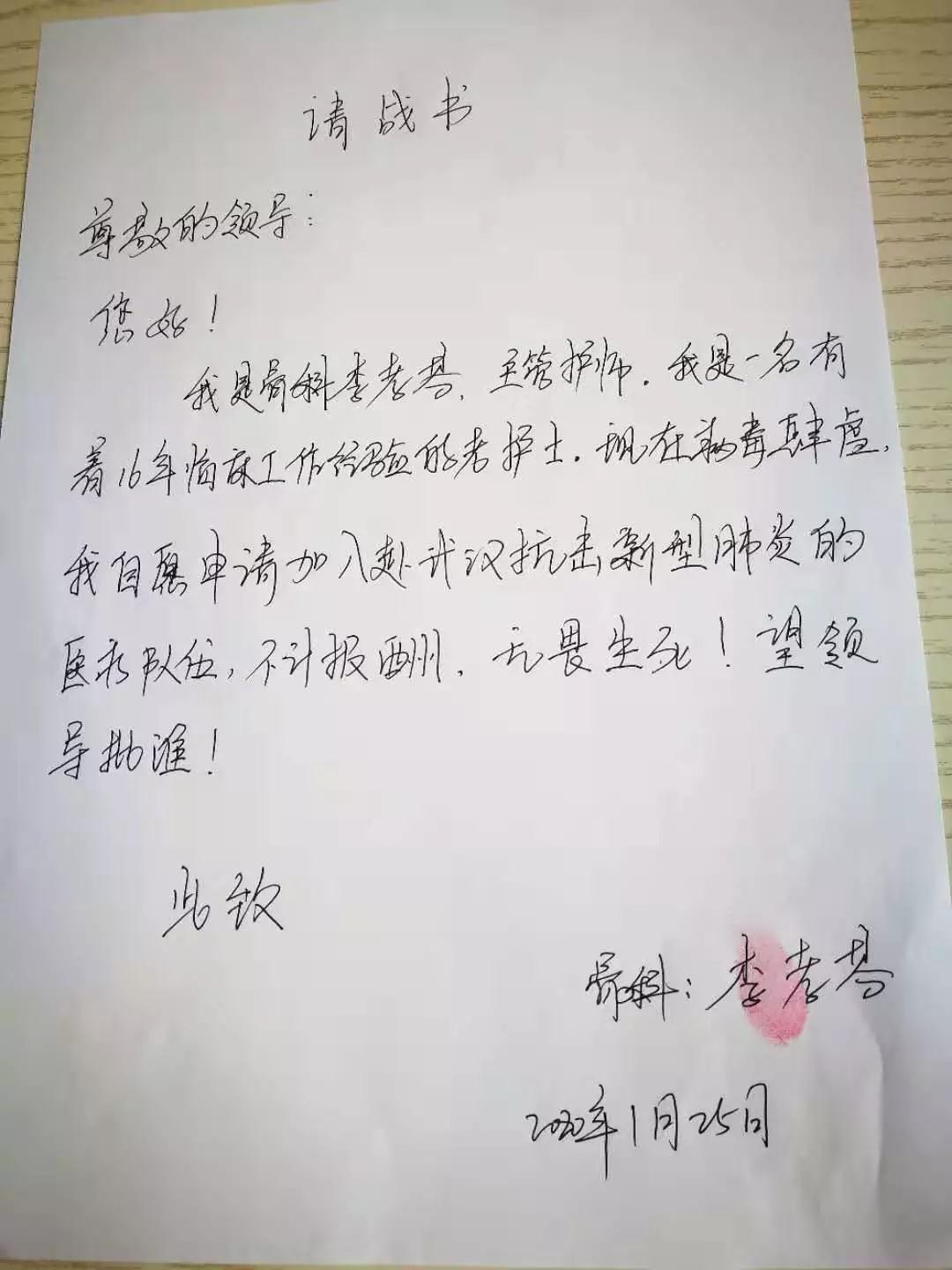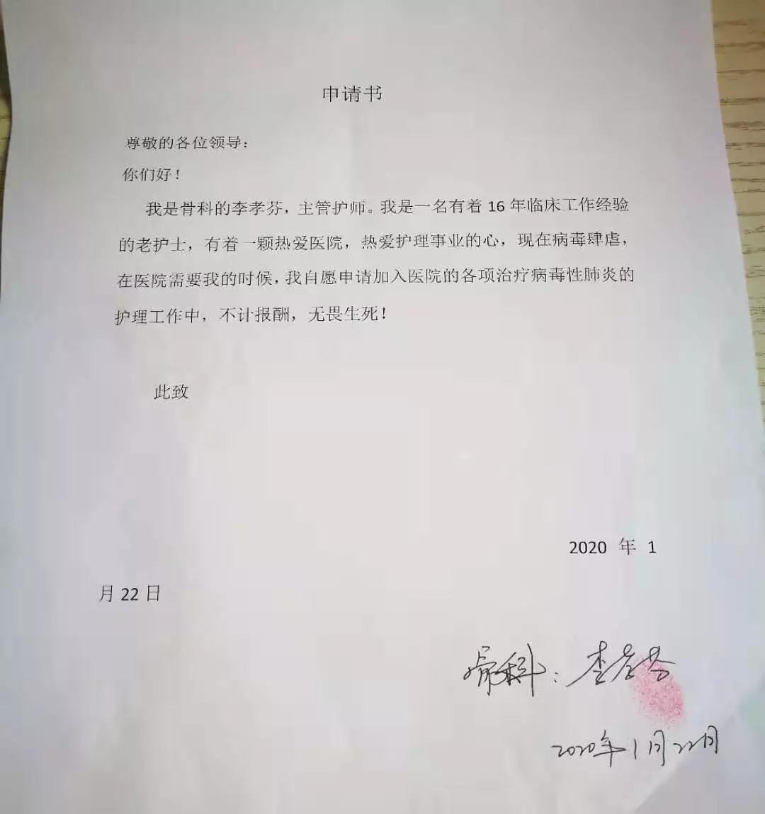 我的反对和孩子的哭诉自然是无济于事。她说:自己能有今天的幸福生活,全靠着党和国家的培养,作为一名入党积极分子,国难面前,舍小家顾大家,这是我必须做的。在请战书上,她曾写道:自己在临床工作了16年,积累了丰富的经验,当国家和人民需要她的时候,定当义不容辞。