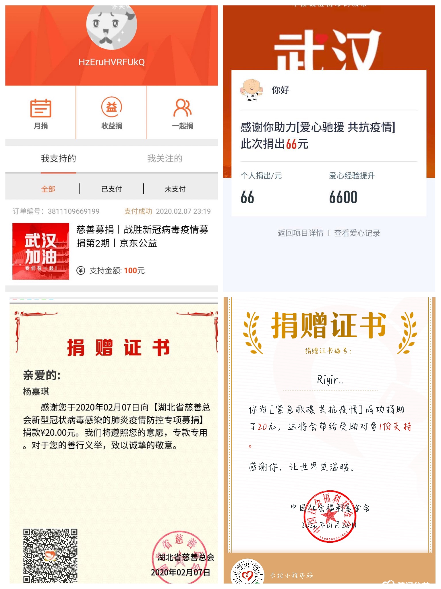 一份爱心就是一份力量,学生党员们还自发通过各种途径向武汉提供支援、进行捐款,他们通过不同方式共参与了10笔捐款项目,共捐赠560元,为打好疫情防控阻击战作出了自己的贡献。