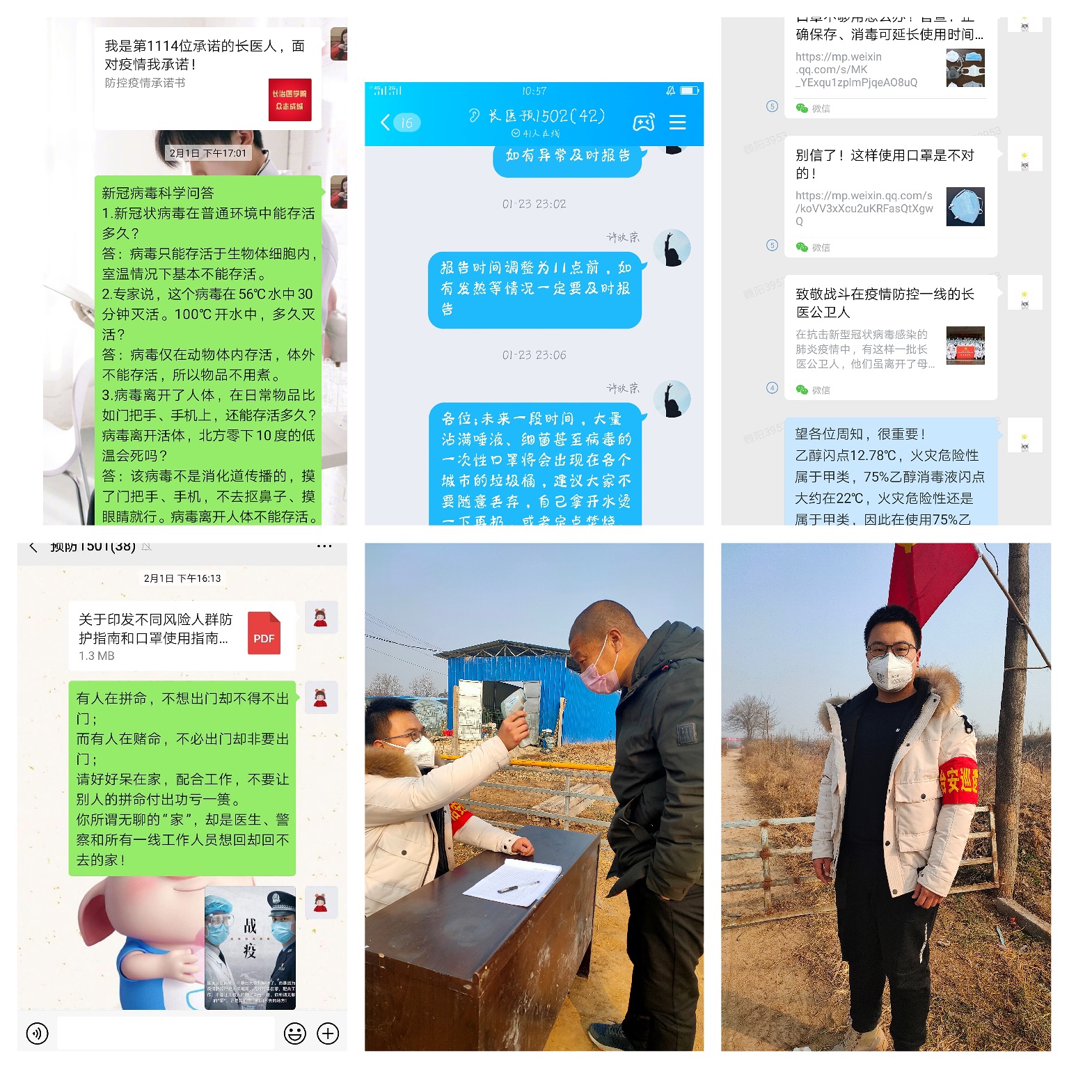 疫情防控期间,学生党员通过班级群进行交流,对新冠肺炎相关知识进行转发,指导同学们做好个人防护的同时,积极了解和汇报本班同学的身体健康状况,主动向亲友宣传疫情的严峻性和主动防护的重要性。2017级学生党员段星宇在做好个人防护的前提下,主动参与居住地疫情监测点志愿服务工作,认真细致宣传疫情防护知识,并为来往人员测量体温,充分发挥了党员的先锋模范作用。