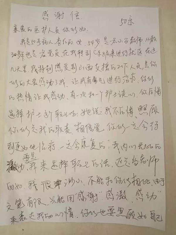 从出征到现在,学校、医院各级领导对我们关爱有加。李华荣书记出发前专门打电话嘱咐我,一定组织大家要注射提高免疫力针剂,为大家做好预先防护;尚进平书记也多次电话、微信对大家嘘寒问暖,时刻关注大家工作生活状况;宋志斌院长也不忘在元宵佳节为大家送上节日祝福;李宏倬书记时刻提醒我要做好大家思想工作,做好后勤保障;连长红院长得知武汉降温急忙给大家邮寄电热毯;程红萍主任、刘瑾科长也一直惦念着我们;护士长们、同事们天天微信为我们加油打气......