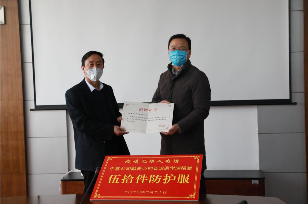 众志成城战疫情,爱心企业在行动。2月20日,我校公共卫生与预防医学系联系的校企合作企业山西中嘉加泰生物科技有限公司副总经理冯庆刚、史沁明一行前来学校,为我校捐赠了50套防护服。副校长王金胜、公共卫生与预防医学系主任郭崇政、党委(学院)办公室主任王黎刚、后勤保障处处长唐建亭等出席捐赠仪式。