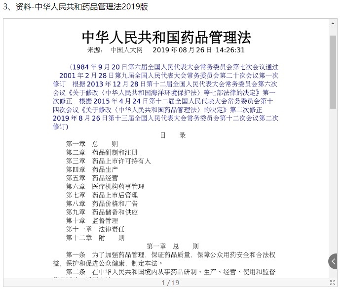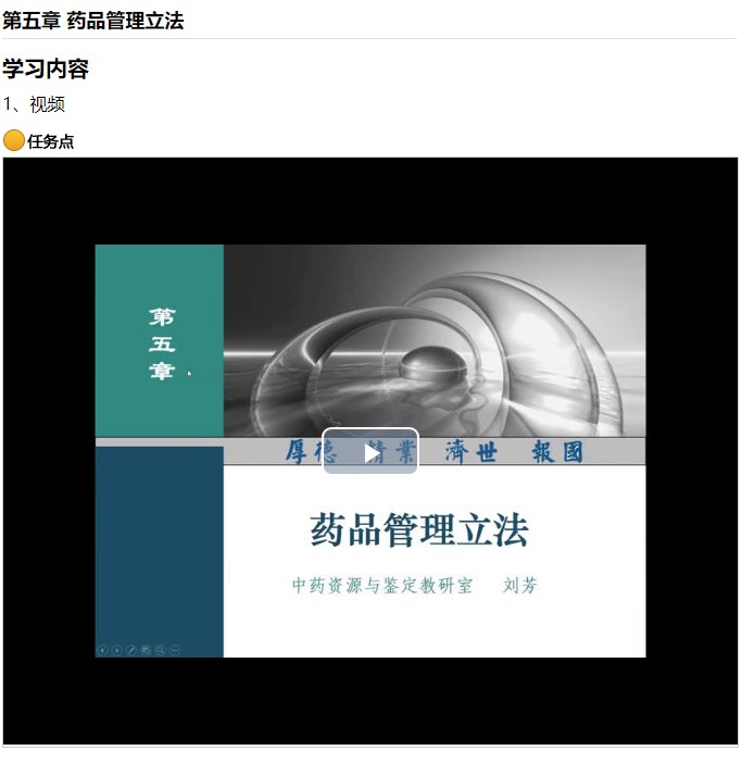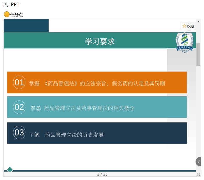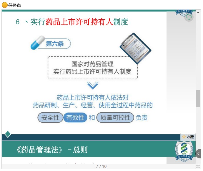 线上内容包括学习目标、PPT、视频讲解、阅读资料等内容,主要围绕我国药品管理立法的概述展开,包括药品管理法的概念、立法权限划分、法定程序,以及我国药事管理法的概念、渊源、基本特征等内容。另外,我国新版药品管理法于2019年12月1日起施行,教师重点介绍了《药品管理法》的总则部分,包括立法目的、使用范围、立法原则等内容,突出介绍了新版药品管理法中新增的药品上市许可持有人制度、药品追溯、药物警戒制度等亮点内容。