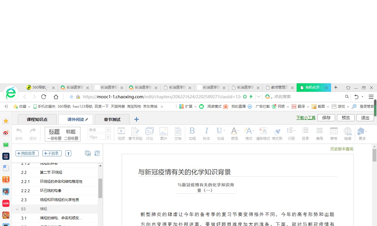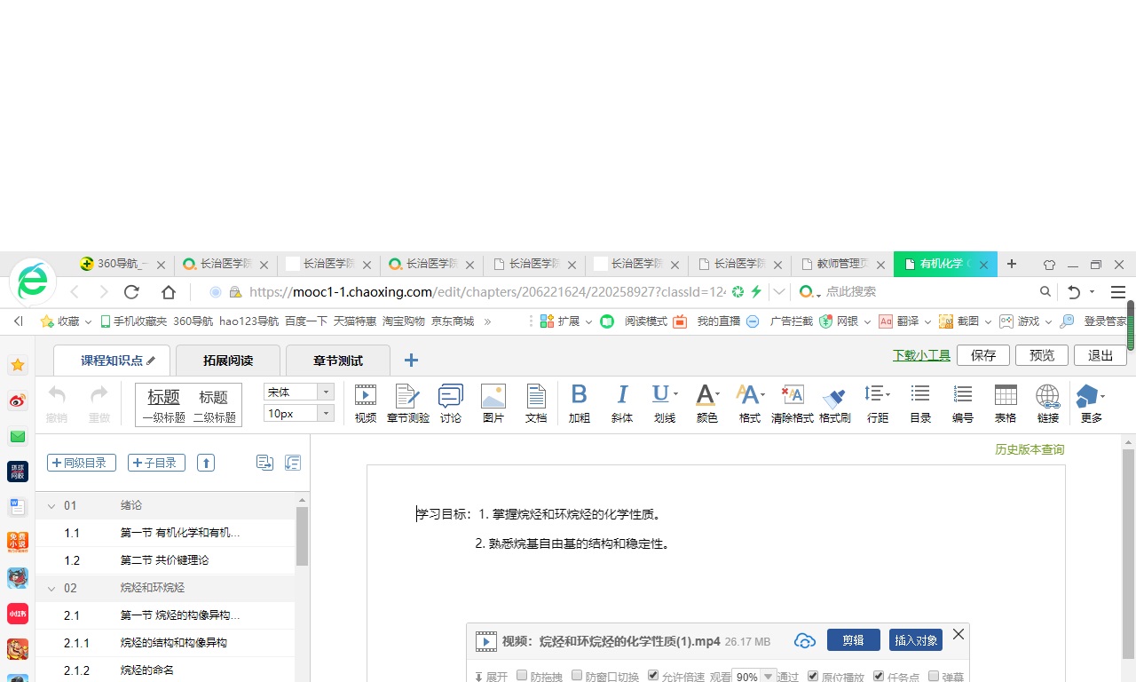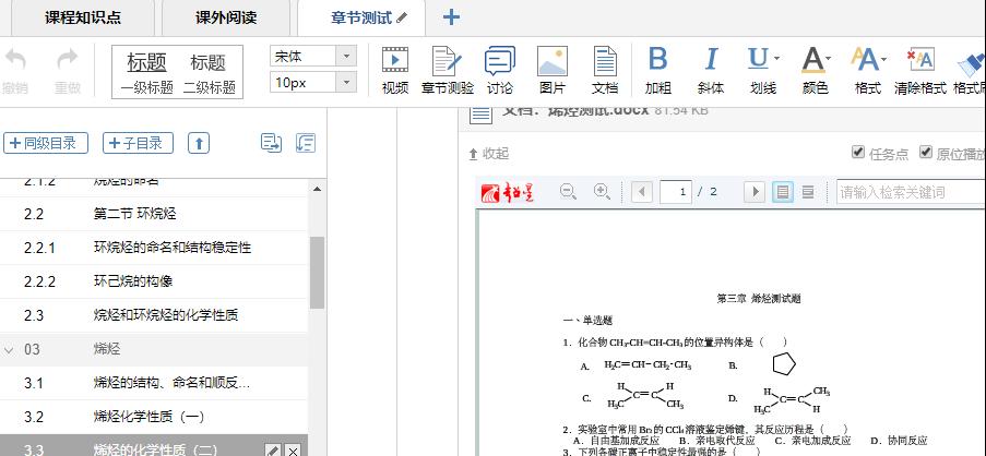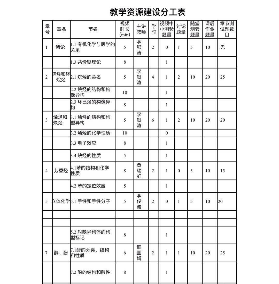 药学专业《有机化学》理论62学时,在学习通平台建课,包括课程章节、教学团队、教学资源、教学大纲、教学日历、教学方法和参考教材等。教学资源包括教学视频、学习目标、拓展阅读、章节测试、习题库、考试库等模块,不仅满足了学生线上学习的要求,还满足了线下学习的需要。不同模块由教学团队按照章节知识点分工录制,统一教学PPT模板,知识点、测试题的难易程度、随堂练习以及课后作业量等经过反复修订、不断完善后,逐渐建设起来。在每个课程知识点都设有学习目标,能够有效地指导学生进行线下学习;每章都增加了拓展阅读,题材与时俱进,兼有中英文材料,拓宽了学生获取知识的渠道;每章设置了章节测试,题型由基础题、发散题和拓展题等构成( 例如:5道基础题+ 4道发散题+ 1道知识拓展题) ,并设定不同分值,及时了解学生学习的困难和学以致用的能力。