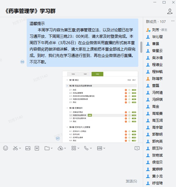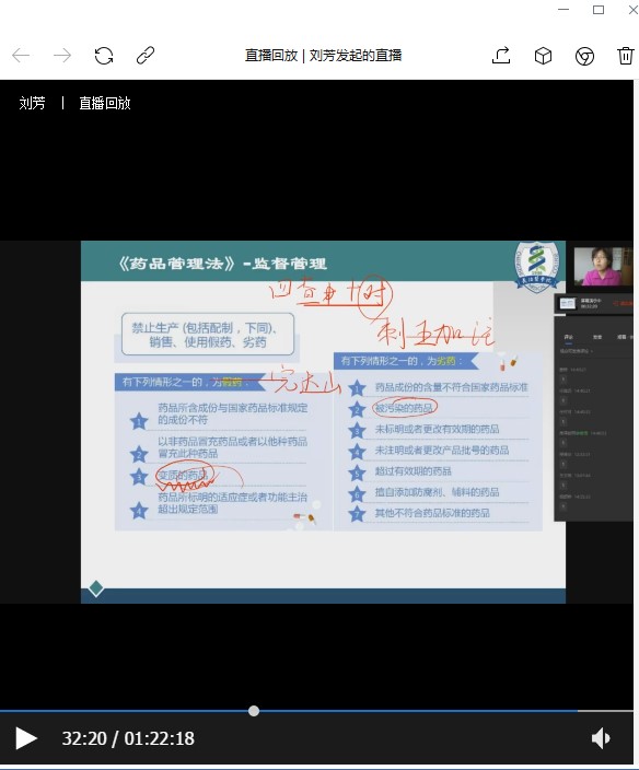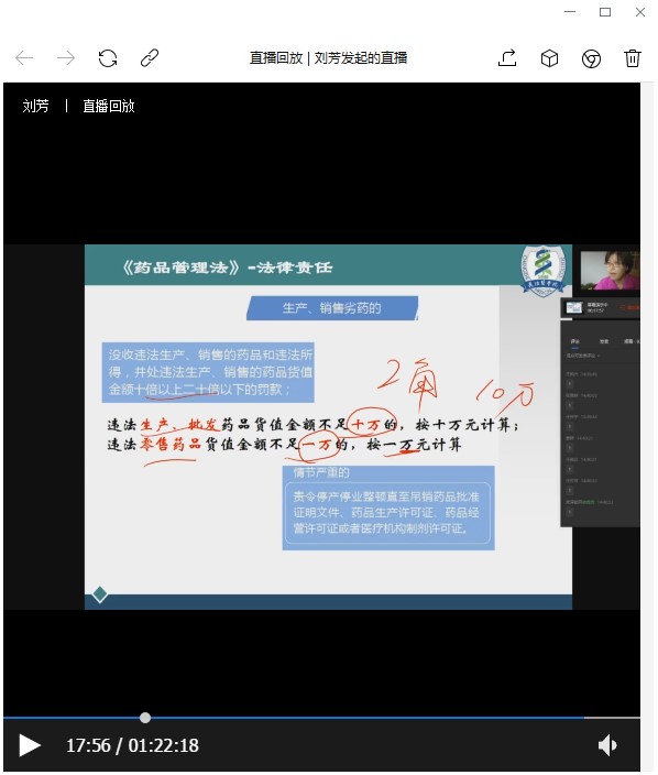 课前在企业微信群中发布本周学习内容及直播时间,直播前先在学习通上打卡,再在企业微信中进行视频直播课。在直播课中,教师重点围绕本次修法后假劣药的内容进行了讲解,对假劣药的界定逐条结合具体真实案例进行分析,并通过提问、回答的方式与同学进行交流。结合“陆勇案”、电影《我不是药神》介绍真实案例对我国法治建设的推动,引导学生自觉遵法、守法、护法。