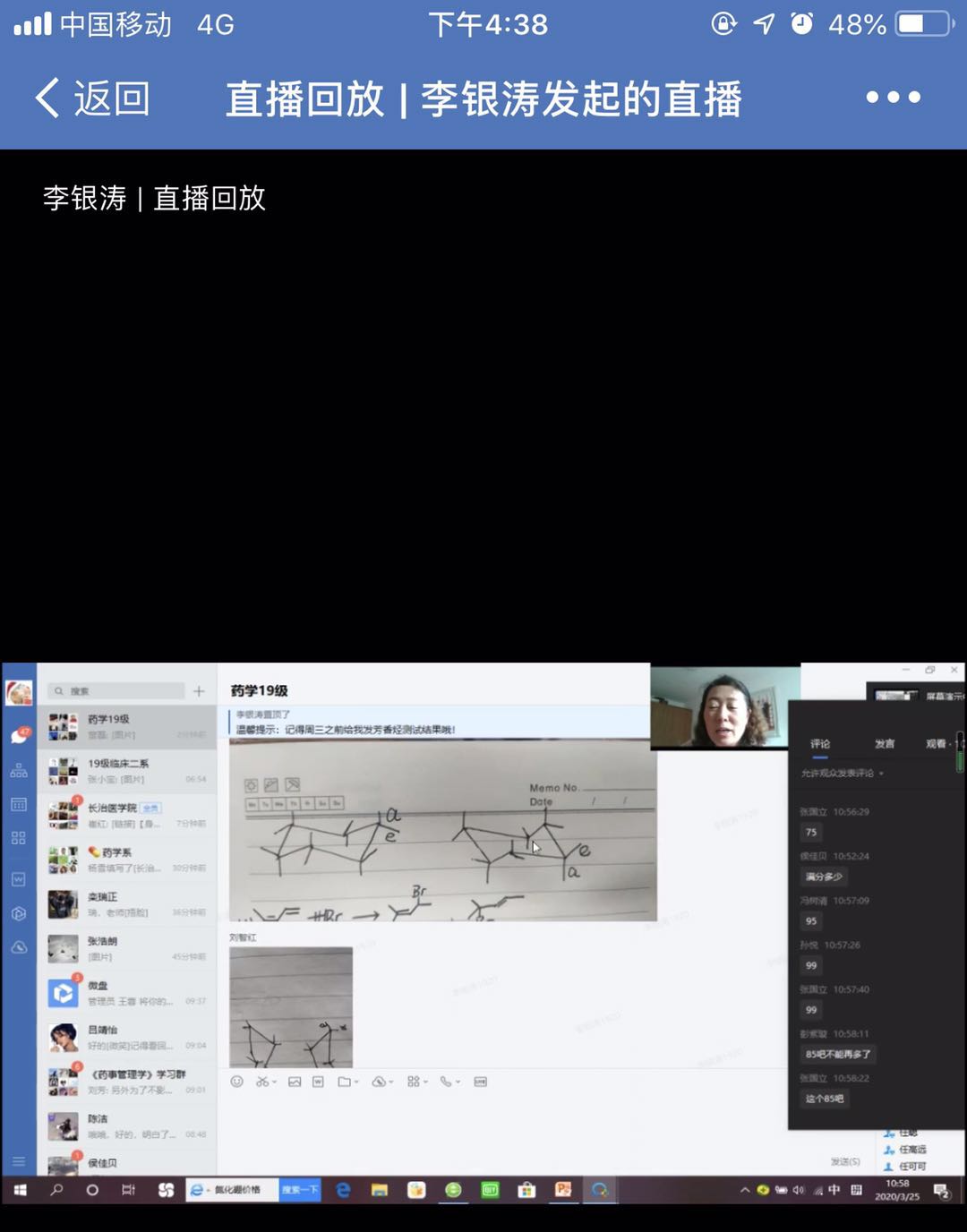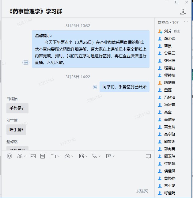 开学前一周,药学系尝试通过学习通“线下监控+直播教学+课堂互动”的方式来组织教学,但开学第一天,网络拥堵,学习通崩盘。紧接着又尝试“微信语音通话”“企业微信会议”,但是教学过程不能回放。经过多次摸索,最终结合学习通平台,采取了企业微信“直播+会议讨论+答疑”的教学方法。