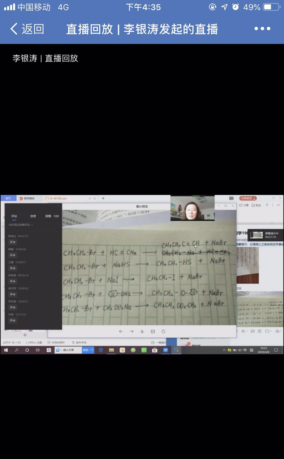 (2)直播互动:直播中,通过连麦、随堂练习、教师点评、学生互评、会议讨论等多种方式相结合,使师生在时空分离的状态下完成教学。直播过程中,教师不定时关注学生学习动态、观看人数,组织课堂练习并随机点名、上传点评,及时表扬、鼓励参与互动的同学。对于被点名而未到课的同学,课后主动关心,提醒观看回放,保证每一位学生都不掉队。