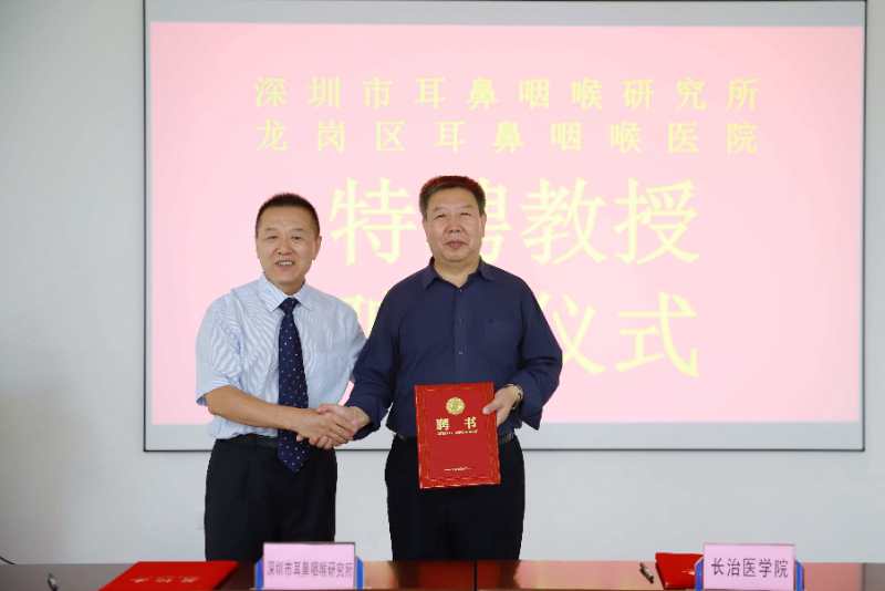 会上,观看龙岗区耳鼻咽喉医院十周年纪念宣传片后,郑建中充分肯定了医院的临床技术、科研实力、人才队伍建设、医疗服务质量等。现场,双方达成合作共识并签约,邱书奇为郑建中颁发聘书,正式聘任郑建中为该院特聘教授。