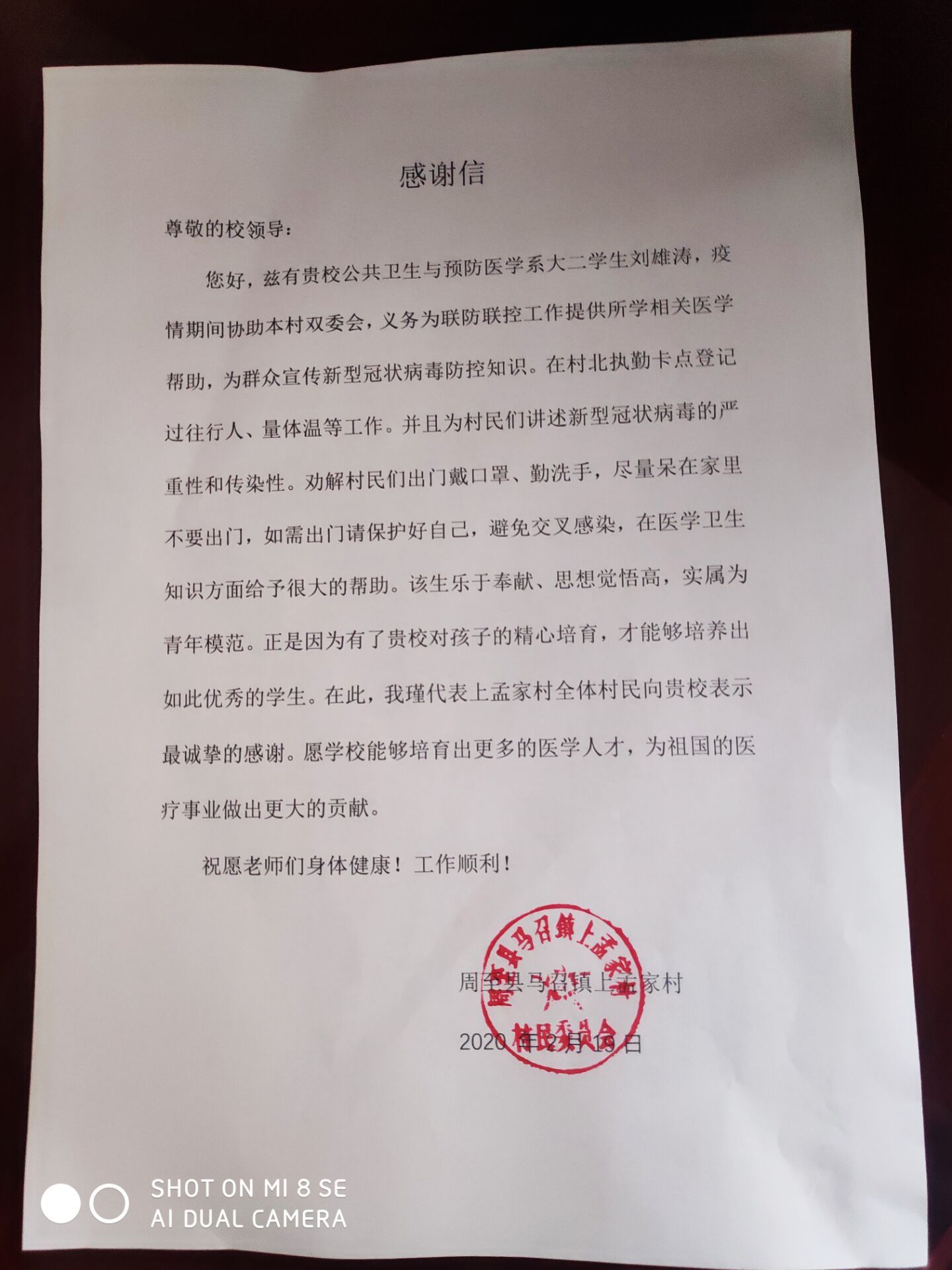 近日,我校收到一封来自陕西西安的感谢信。原来是公共卫生与预防医学系预防1801班学生刘雄涛积极参与当地疫情防控工作,面对疫情勇于担当、乐于奉献、踏实工作,受到当地干部群众的高度赞扬;当地村委会特给我校发来感谢信,感谢学校对学生的精心培养。