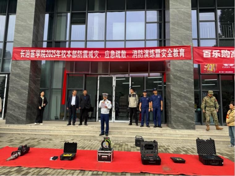 为进一步增强2025级新生的防震减灾安全意识,提升应对突发灾害的应急疏散能力与自救互救技能,我校精心组织开展了防震减灾应急疏散演练暨安全知识宣讲活动,特别邀请长治市消防救援支队全程参与指导,并调配消防车等专业装备协同配合,为演练增添了实战性与专业性。学校党委书记王金胜、党(校)办主任邢育宏等,长治市消防救援支队支队长张胜利等,长治市公安局上党分局禁毒、反恐、反诈等工作人员,2025级新生和辅导员共同参与了此次演练。