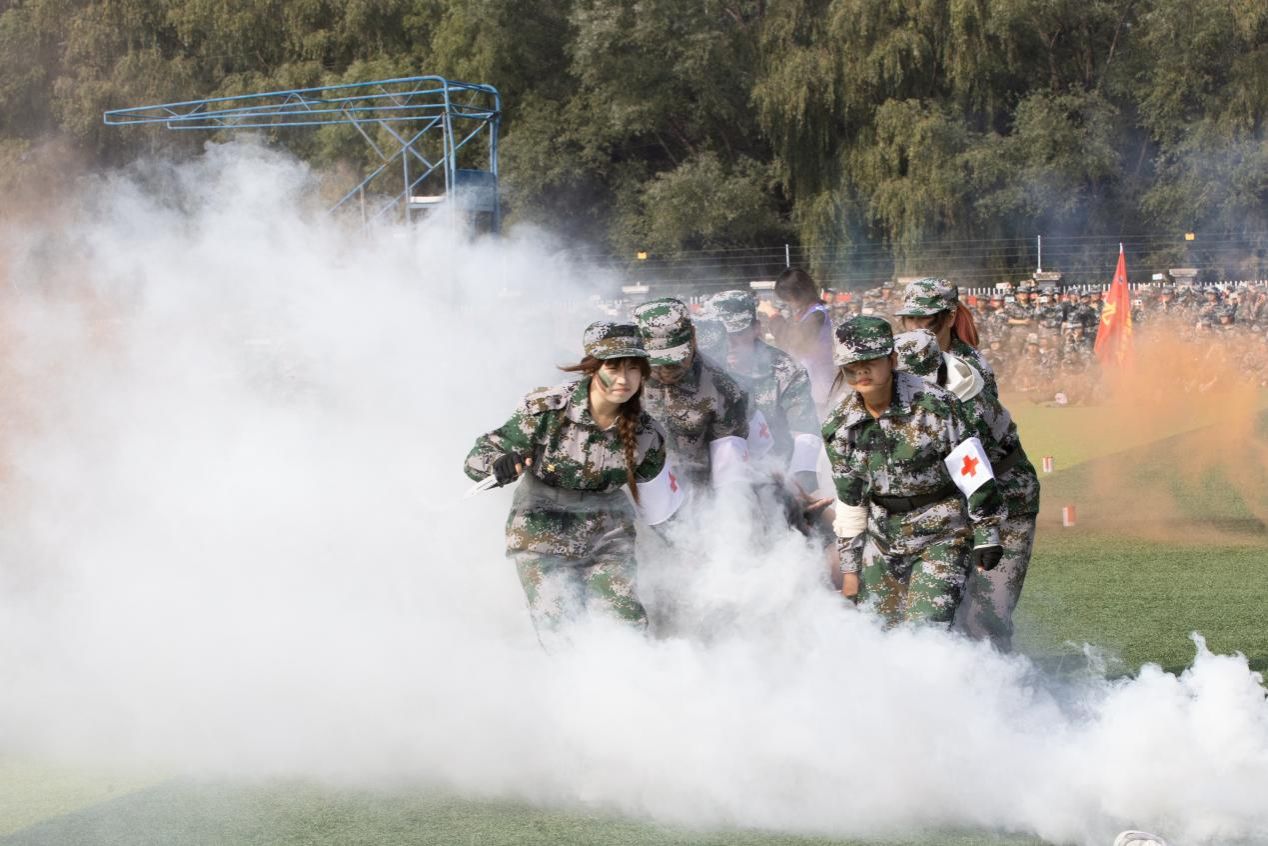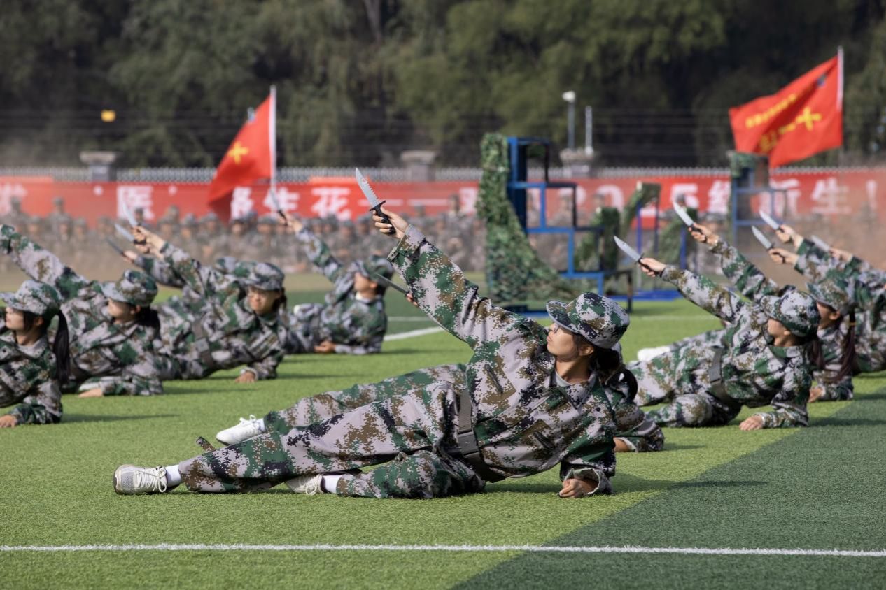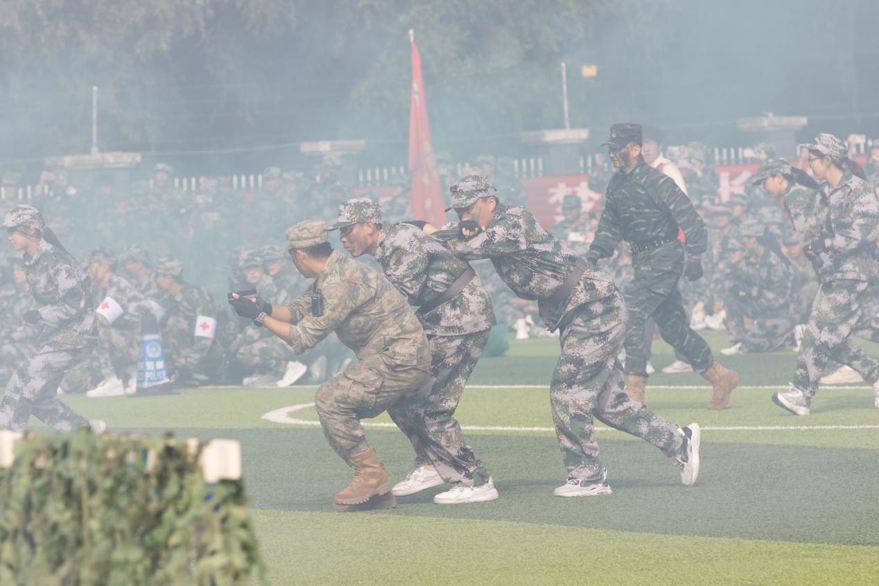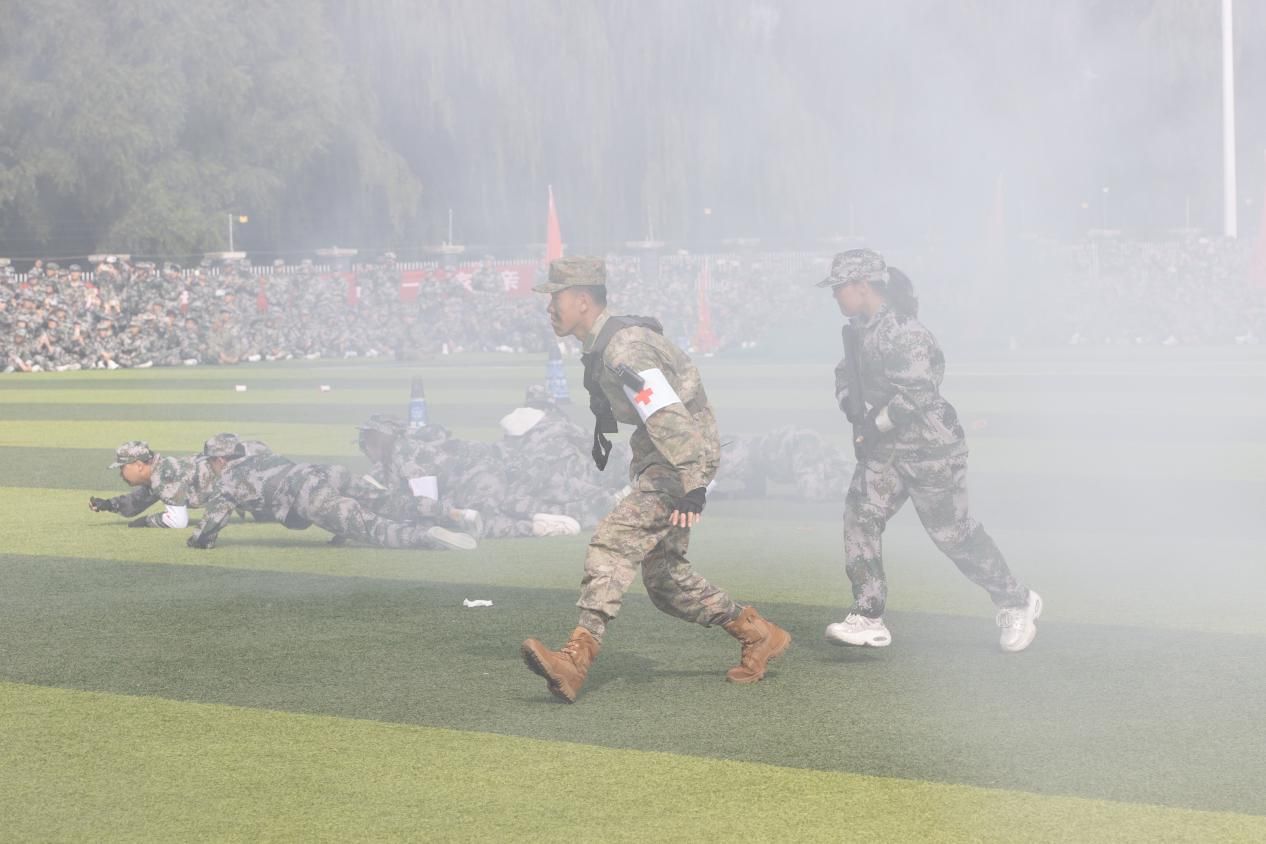 随后,2025级新生以连队为单位进行了分列式汇报表演。22个连队步伐整齐、口号嘹亮、精神饱满,展现出良好的军事素养和昂扬斗志。紧接着,学生方队依次进行了擒敌拳、匕首操表演,动作刚劲有力、连贯娴熟;退役大学生教官进行了队列动作示范表演,展现出过硬的军事作风;教官与学生联合开展的战地救援演练,模拟实战环境,流程专业有序,体现了我校医学特色与军事训练的深度融合。