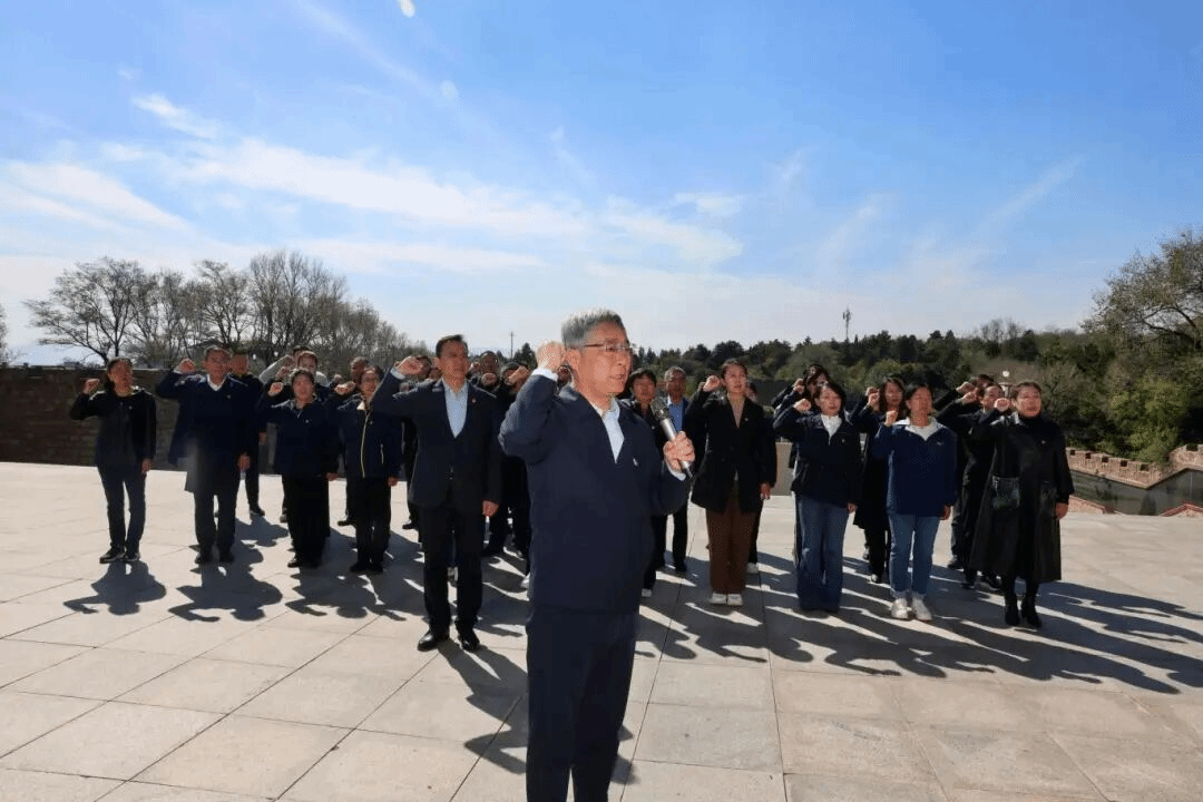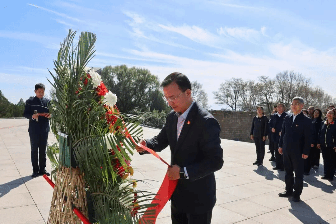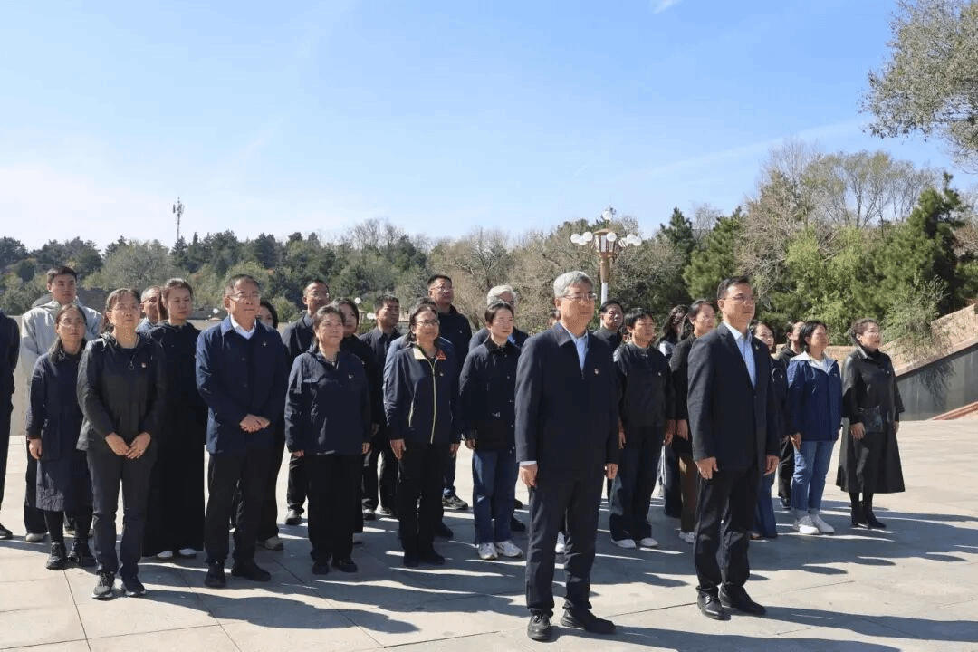 在松柏环绕的百团大战纪念碑上,“战绩辉煌永垂史册” 的鎏金大字熠熠生辉。全体人员整齐列队,在庄严肃穆的氛围中奏唱《义勇军进行曲》,礼兵缓步上前敬献花篮,党委书记王金胜神情凝重地整理缎带,全体人员向纪念碑三鞠躬表达深切缅怀。