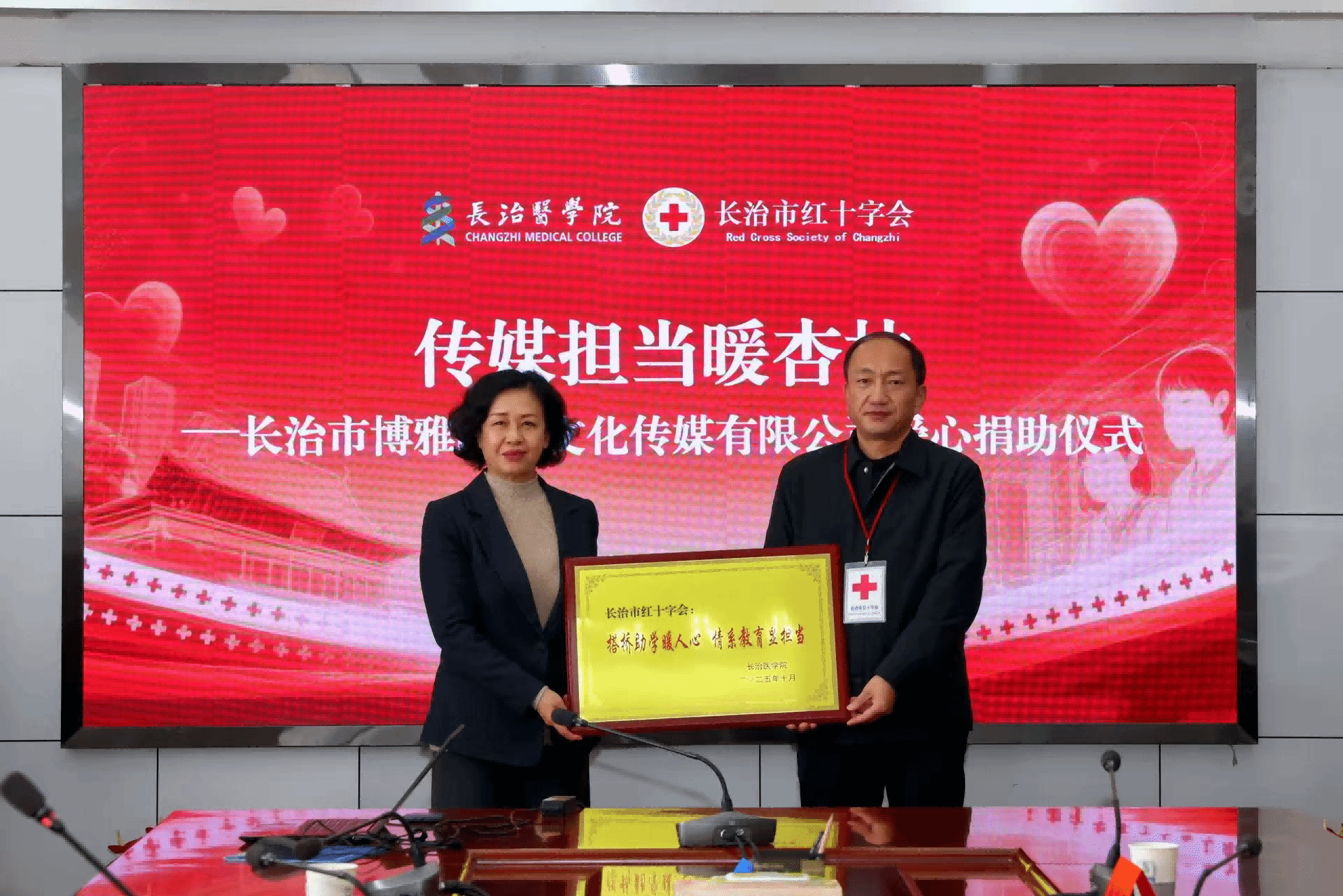 10月28日上午,“传媒担当暖杏林”爱心捐助仪式在我校举行,长治市博雅时代文化传媒有限公司通过长治市红十字会向我校捐资助学,用于奖励品学兼优的贫困大学生。博雅时代总经理暴易航,长治市红十字会党组成员、四级调研员高彦民,校党委常委、副校长来丽娜出席仪式,学工部及各院系师生代表参加,仪式由学工部副部长李永平主持。