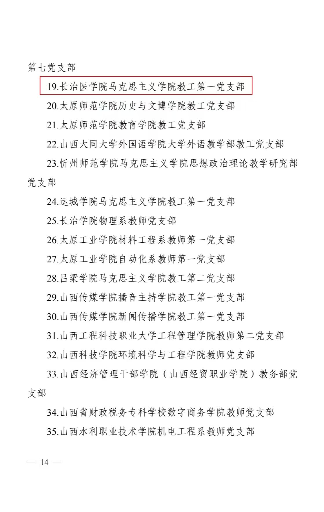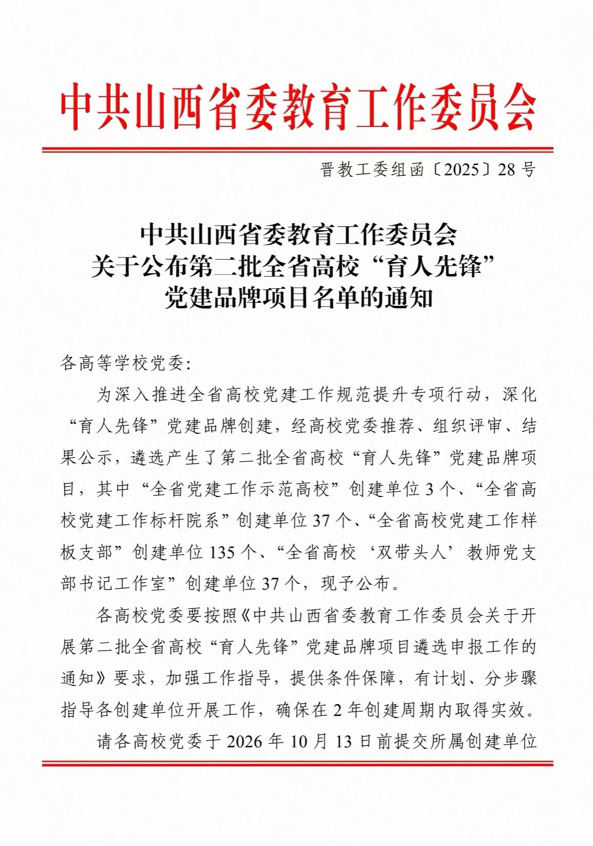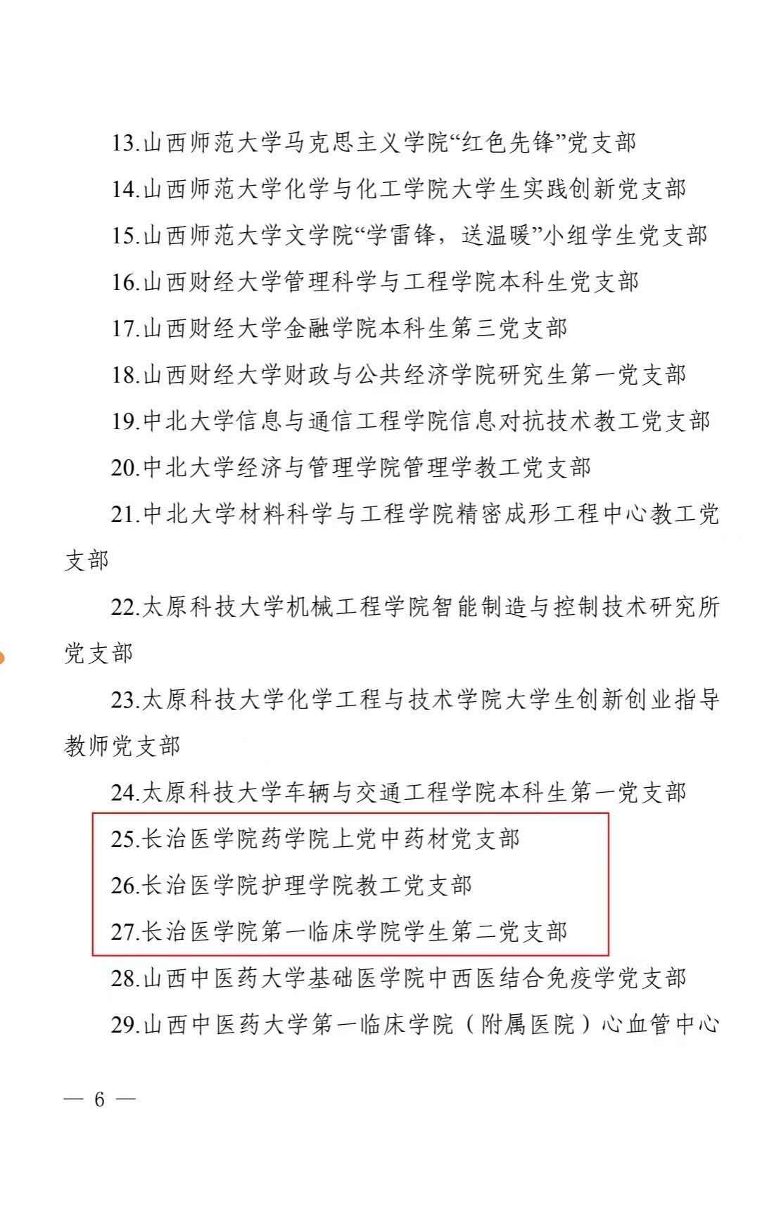 近日,山西省委教育工委公布第二批全省高校“育人先锋”党建品牌项目,我校5个党建项目入选。其中,药学院党总支入选全省高校党建工作标杆院系创建单位,药学院上党中药材党支部、护理学院教工党支部、第一临床学院学生第二党支部入选全省高校党建工作样板支部创建单位,马克思主义学院教工第一党支部入选全省高校“双带头人”教师党支部书记工作室创建单位。
