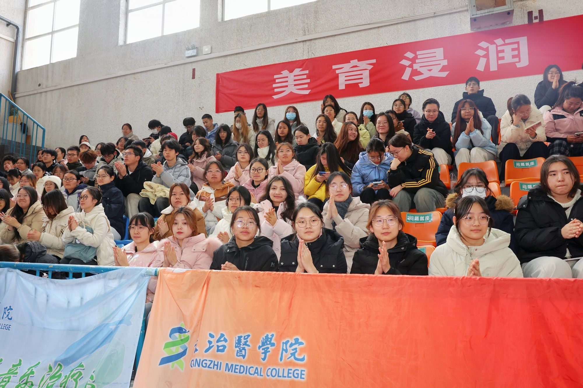 高星宇同学的笛子独奏《扬鞭催马运粮忙》技艺精湛,欢快的旋律让人仿佛置身丰收的喜悦之中。校本部舞蹈队的《打酸枣》充满生活气息,生动演绎了晋东南地区的民俗风情。陈震楠同学深情演唱的《我爱你中国》,以其醇厚的嗓音引发全场情感共鸣。最后,大学生合唱团以《爱的天空》压轴登场,用悠扬的歌声传递医者仁心与青春力量,为活动画上圆满句号。