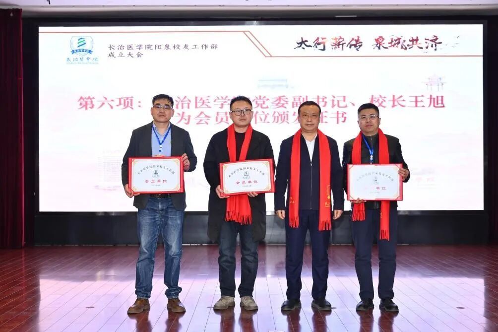 王旭为阳泉校友工作部揭牌,并与邢育宏为阳泉校友工作部成员颁发聘书。