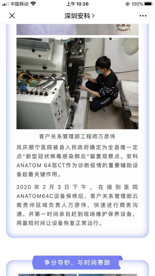 云南省凤庆顺宁医院被县人民政府确定为全县唯一定点“新型冠状病毒感染肺炎”留置观察点,2月3日下午,医院报修CT(ANATOM64C)设备,万彦伟接到通知后,迅速进行商务沟通,并第一时间从山西连夜赶到现场,用最短的时间让设备恢复了正常运行,避免了因长时间停机造成无法估量的损失。