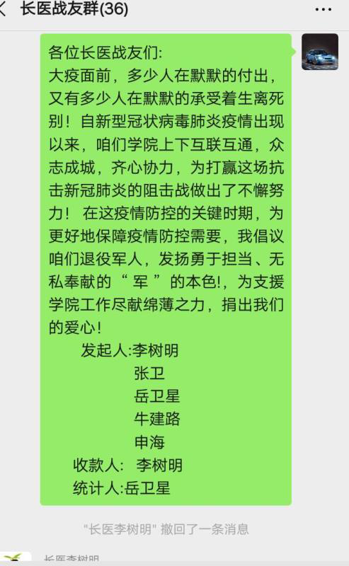 新冠肺炎疫情牵动着长医每一个人的心,为助力我校疫情防控工作的开展,党委(院长)办公室车队的退役军人向学校广大退役军人发出了“发扬勇于担当、无私奉献军人本色,积极抗击疫情”的倡议。倡议一经发出,得到了人事处、办公室、保卫处等部门及附属和平医院、附属和济医院相关同志的积极响应,大家踊跃捐款。