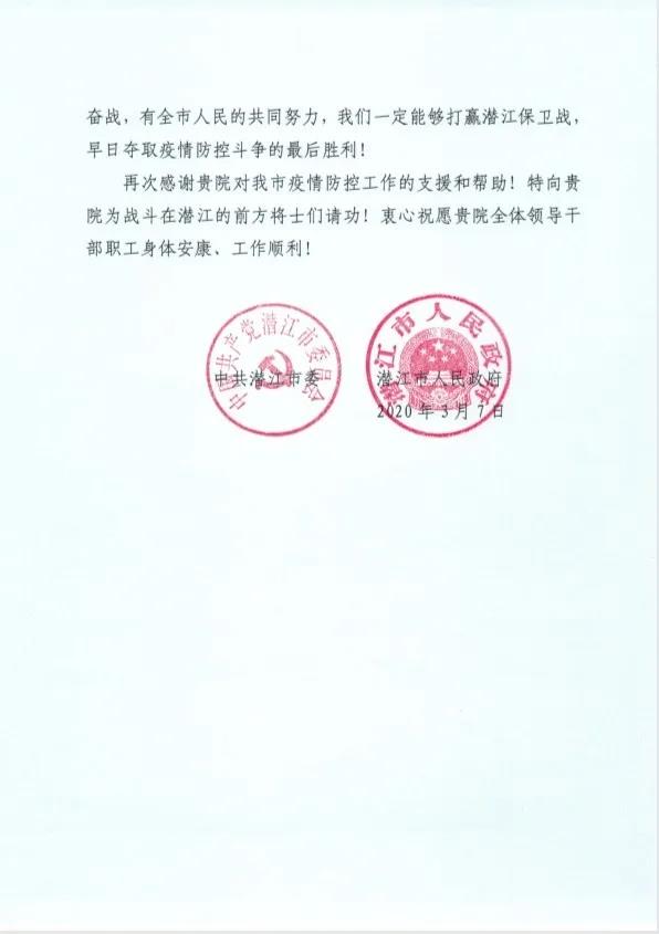 再次感谢贵院对我市疫情防控工作的支援和帮助!特向贵院为战斗在潜江的前方将士们请功!衷心祝愿贵院全体领导干部职工身体安康、工作顺利!