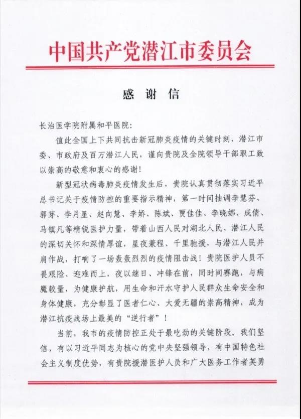 附属和平医院||湖北省潜江市委市政府向我院发来感谢信