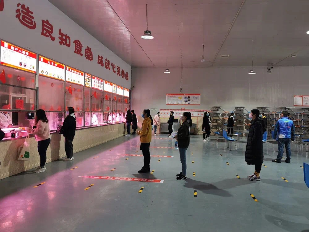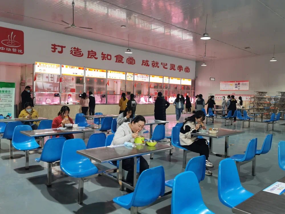 两校区三支餐厅服务队按照工作预案,在餐厅入口处检测学生体温,并控制进入餐厅的人流量,指引学生自带餐具沿地面标示线到窗口有序打饭,一人一桌同向就餐,就餐间距大于1米。餐后自觉佩戴口罩、携带餐具,按一米间距排队从出口处离开。