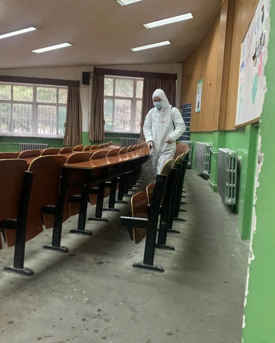 为确保校园环境安全,在学生返校之前,校园消杀组志愿者不畏疫情、不怕吃苦,在校本部和五龙校区同时开展消杀工作,每天三次对学生公寓、教室、餐厅等场所进行集中消毒,将消毒工作努力做到全方位、全覆盖、无死角,不留一丝隐患,他们从三尺讲台走上校园抗“疫”一线,是我们心目中的大美长医守护者。
