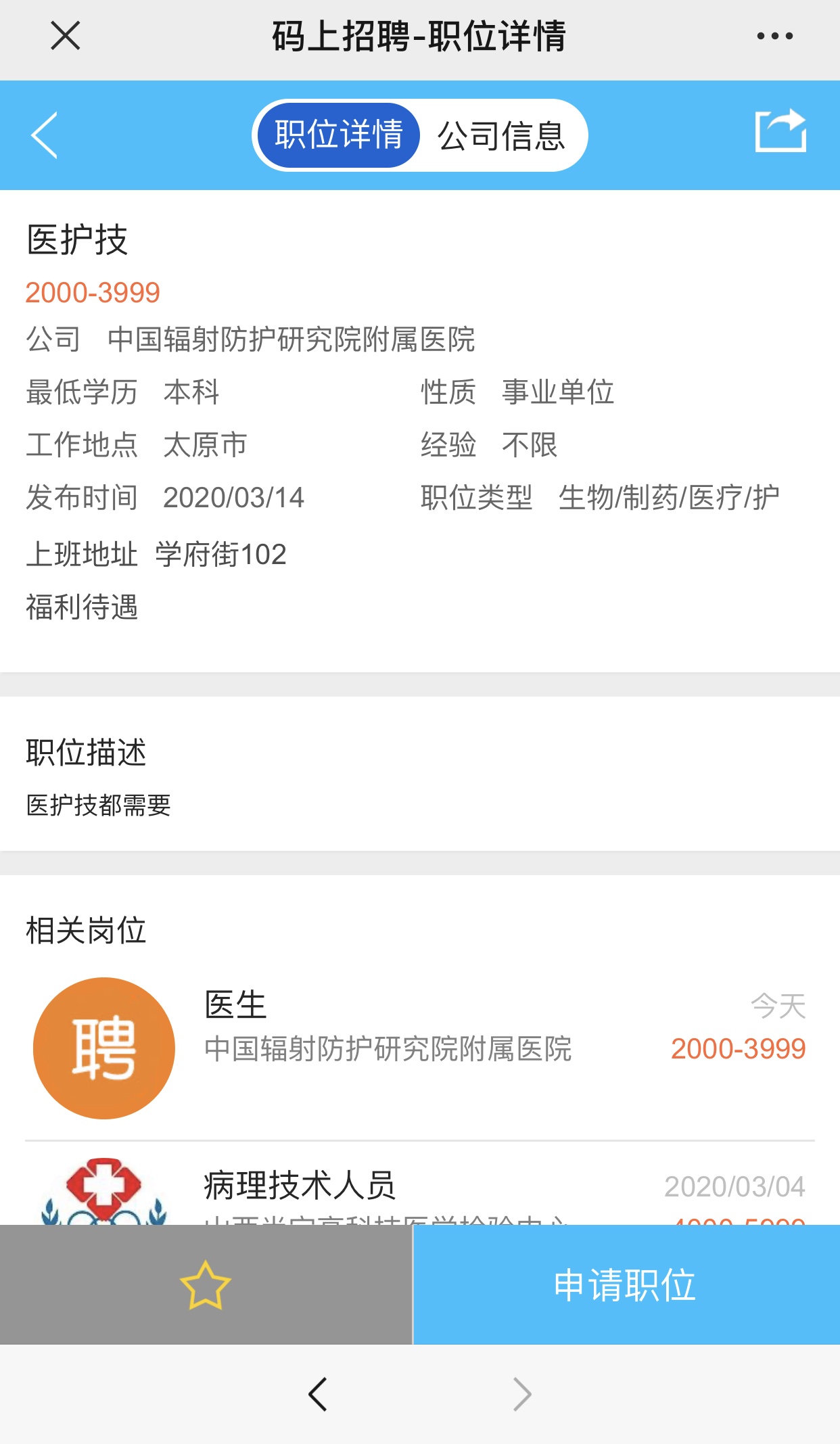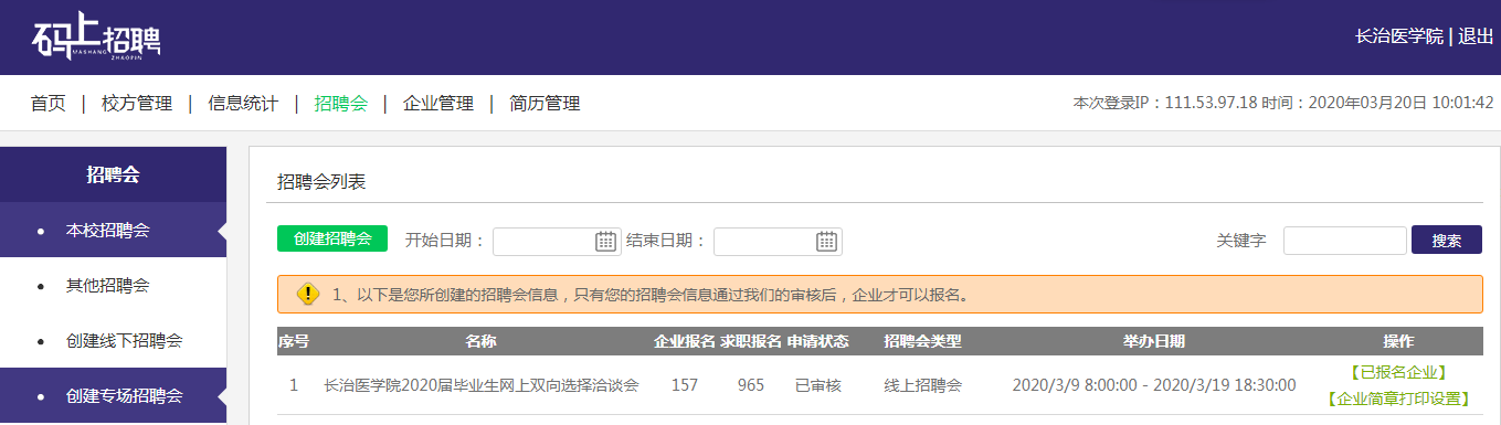 此次招聘会是我校与第三方平台“码上招聘”首次合作进行线上招聘活动,据初步统计此次线上招聘会报名参会单位157家,提供就业岗位需求1976个,我校2020届毕业生957人参加招聘会,毕业生共投出简历1064份,平台数据反馈用人单位与毕业生共达成初步就业意向223个。据悉此次线上招聘会用人单位涉及山西、北京、河北、天津等10个省市。单位类别涵盖医疗卫生、生物科技、药业器械、金融商贸等行业领域,岗位需求与毕业生专业之间的匹配度较高,基本覆盖了我校所有专业。网上招聘会通过第三方平台集成了用人单位信息岗位查询,学生信息查询,网络直聊等功能,毕业生可以通过手机了解企业招聘信息、投递简历,用人单位与学生可以通过视频交流并组织网络面试,减少了人员流动,实现了便捷沟通,达到了供需双赢。