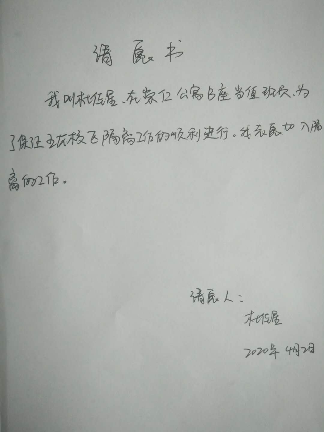 4月初,五龙校区工作人员召开紧急会议,安排有关迎接返校生事宜。会上,包括食堂、公寓、管理人员在内的所有工作人员都纷纷请愿加入到封闭管理工作中,公寓值班人员杜佳星还写下了请愿书。校区封闭管理期间,保卫人员严格把控人员、车辆出入五龙校区,坚持夜间巡逻,筑牢抗击疫情的第一道防线。