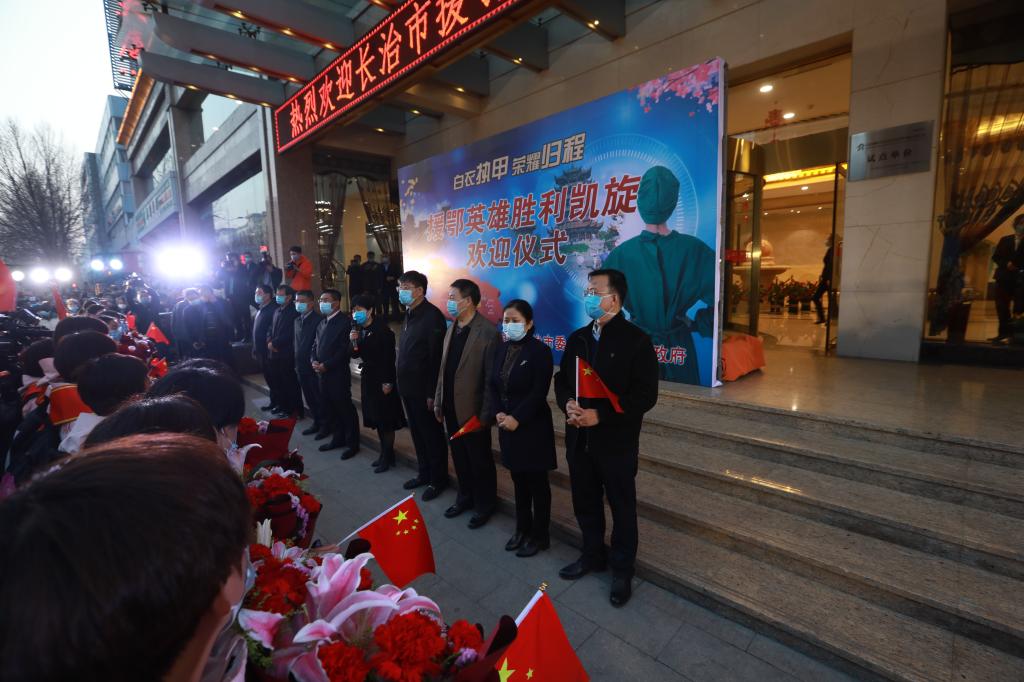 春已至,英雄归。3月23日下午6时20分,我校附属和平医院9名、附属和济医院4名援鄂医疗队抗“疫”天使,平安凯旋!我校郑建中校长、王金胜副校长出席长治市简短隆重的欢迎仪式,同长治市委、市政府、市卫健委领导,附属和平医院、和济医院党政领导、医护代表一起欢迎英雄回家。