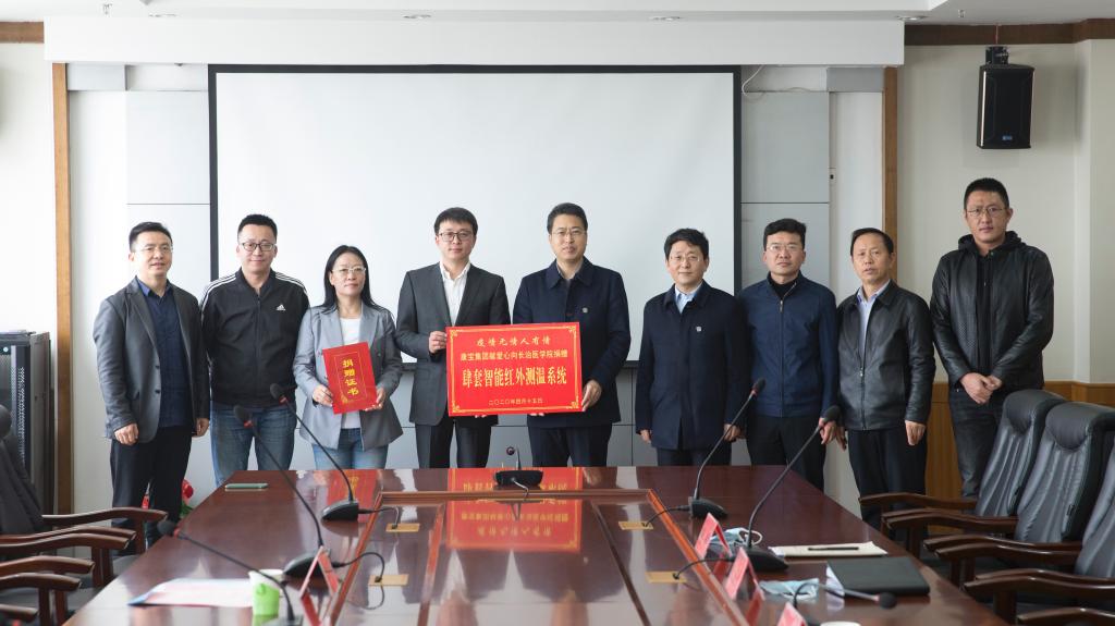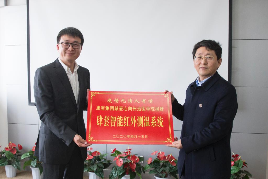 4月15日,康宝集团、长治欢乐天使小丑医生志愿服务中心向我校捐赠防疫物资,捐赠仪式在学校科技楼11层1号会议室举行。康宝集团董事长、长治欢乐天使小丑医生志愿服务中心名誉会长周楷,康宝集团副董事长周磊,长治欢乐天使小丑医生志愿服务中心名誉会长桑小燕、会长王震杰一行四人向我校捐赠了四套总价值近30万元的全智能红外线测温系统。我校疫情防控领导小组组长、党委书记李华荣,疫情防控领导小组副组长、党委常委、副校长宋晓亮,相关职能部门负责人参加捐赠仪式。捐赠仪式由宋晓亮主持。