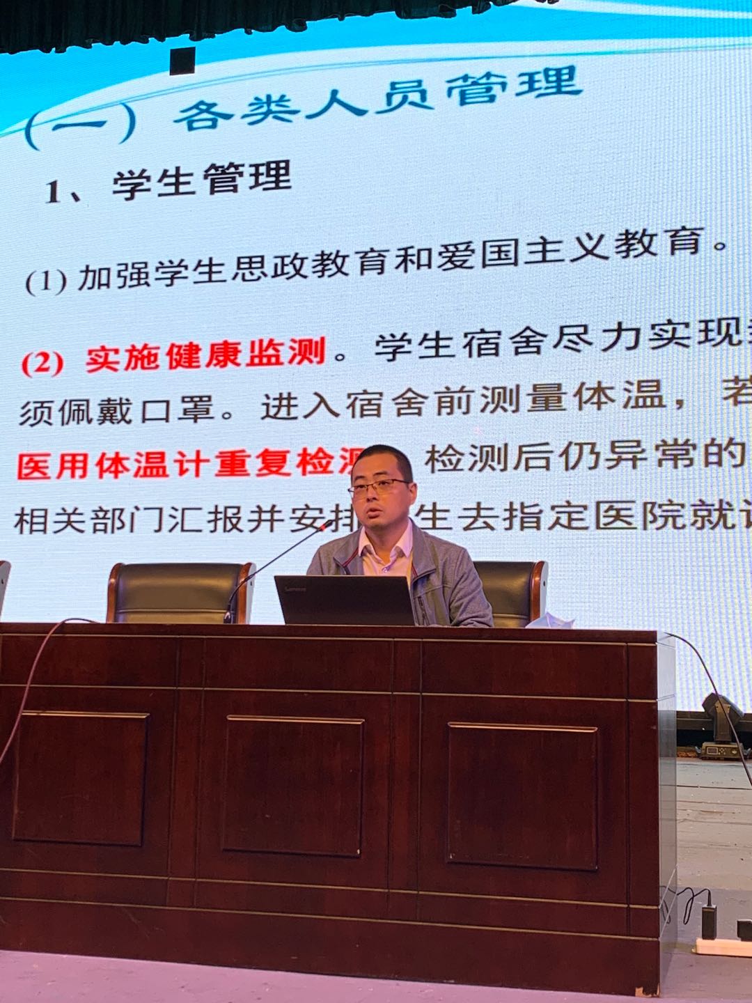 培训会邀请我校公共卫生与预防医学系流行病学教研室饶华祥博士主讲。饶华祥博士围绕学校疫情防控工作的实际,就新型冠状病毒感染肺炎防控知识普及、开学返校前准备工作和返校途中及返校当日指引、消毒基础知识、正确使用口罩等内容展开细致讲解。