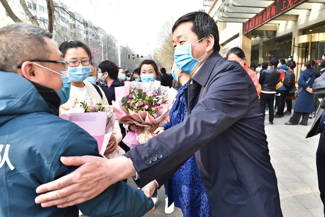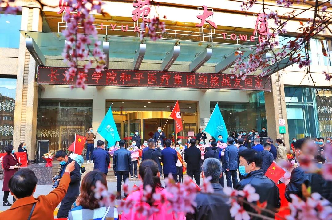 和平医疗集团在财苑宾馆门口举行了欢迎仪式,迎接抗疫英雄平安回家。