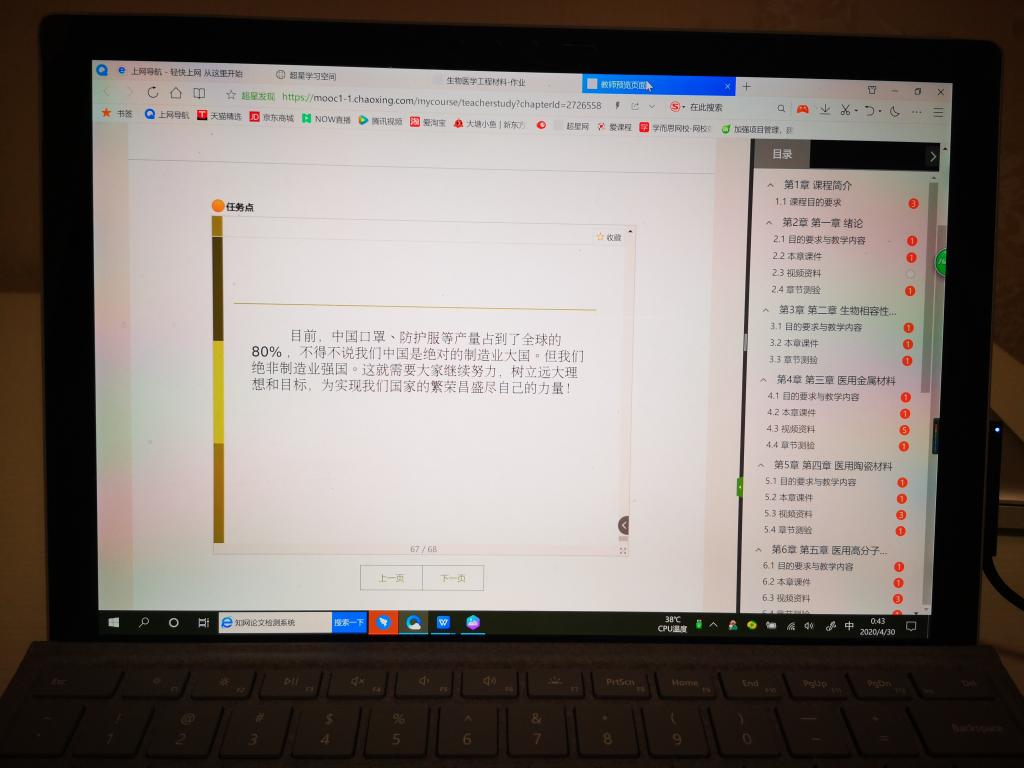 申玉坤老师讲授《生物医学工程材料》课程时,从大家现在热谈的“口罩”,引出“聚丙烯”这种高分子材料。口罩的内外两层是无纺布,中间层是熔喷布,其实都是以“聚丙烯”为主要原料的;口罩不渗水,而且中间层的熔喷布遇火不会燃烧,就是因为把“聚丙烯”作为了主要的原料,从而引出了“聚丙烯”的结构和特点,通过实例使学生更好地了解了“聚丙烯”这种材料。她讲到,中国的口罩、防护服产量占全球的80%,就像近日美国纽约州州长接受采访时说:“我们需要口罩,中国制造的;我们需要防护服,中国制造的;我们需要呼吸机,中国制造的;怎么都是中国制造的”。不得不说中国的制造业已位居世界前列,但同时我们要保持清醒头脑,虽然我们是制造业大国,但我们绝非制造业强国,她鼓励学生们继续努力,为实现国家的繁荣昌盛贡献自己的力量。课程最终落脚到让学生们好好学习,树立远大理想。